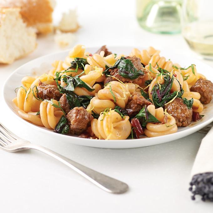 Vesuvio Pasta with Spicy Sausage and Swiss Chard