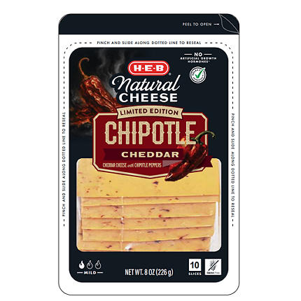 50¢ off H-E-B Natural Chipotle Cheddar Cheese, Shredded or Sliced, 8 oz.