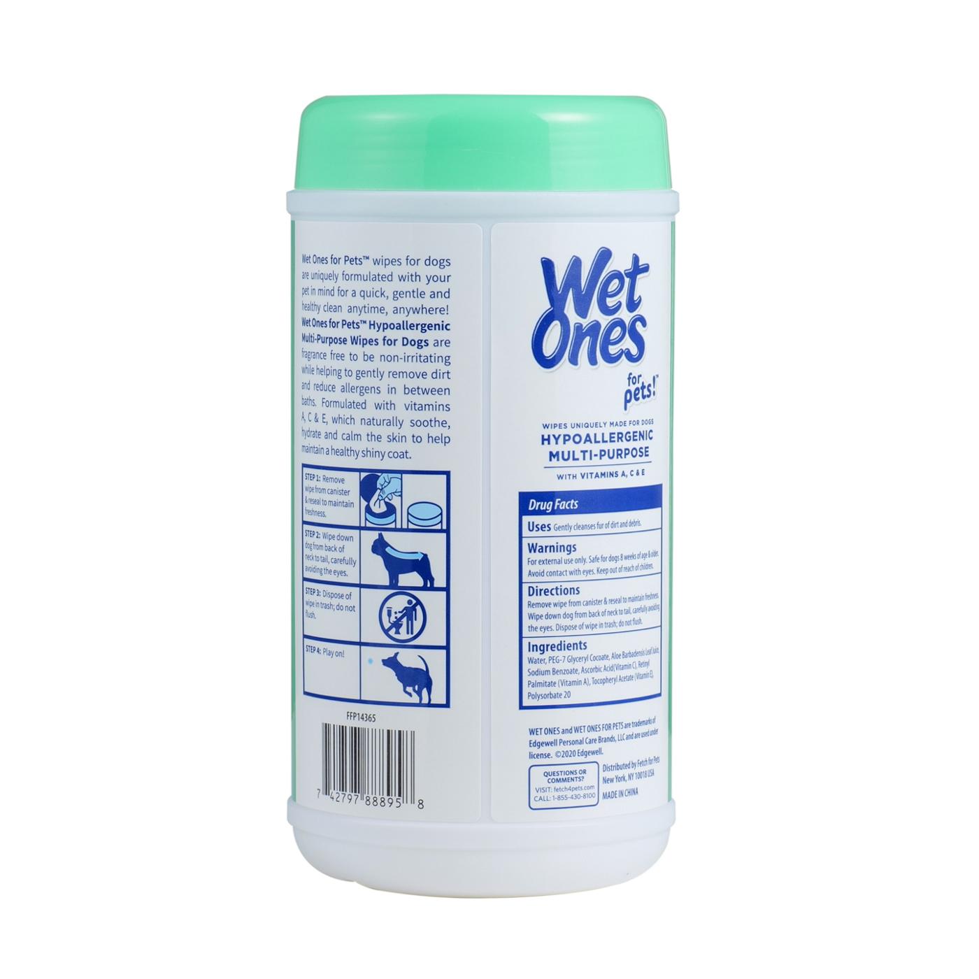 WET ONES WIPES FOR DOGS - Wet Ones hand wipes are now available for your favorite furry friends. The same team that brought you Wet Ones wipes for humans now has dog wipes for ears, dog wipes for eyes,and dog wipes for snouts DOG WIPES - Great for dogs with sensitive skin and dogs with dry skin, these Wet Ones Wipes for Dogs are mild yet effective for dirt and debris FRAGRANCE-FREE PET WIPES -Unscented dog wipes are mild and suitable for all dogs, especially those with an aversion to scents and fragrances EASY TO USE - The Wet Ones for Pets 50 count canister is easy to use and closes to lock in moisture and freshness. After you're done using the wipes, simply close the top to keep wipes moist WITH VITAMINS A, C & E - In order to keep your puppy's skin and coat healthy, nourished, and moisturized, these wipes for dogs from Wet Ones include vitamins A, C & E for an all-over feel-good clean