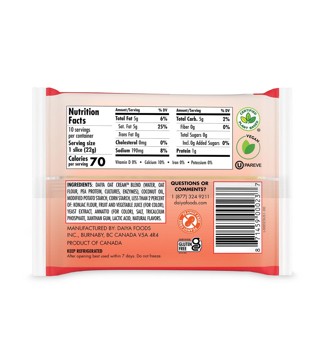 Daiya Oat Cream Blend (Water, Oat Flour, Pea Protein, Cultures, Enzymes), Coconut Oil, Modified Potato Starch, Corn Starch, Less than 2 Percent of: Konjac Flour, Fruit and Vegetable Juice (for Color), Yeast Extract, Annatto (for Color), Salt, Tricalcium Phosphate, Xanthan Gum, Lactic Acid, Natural Flavors.