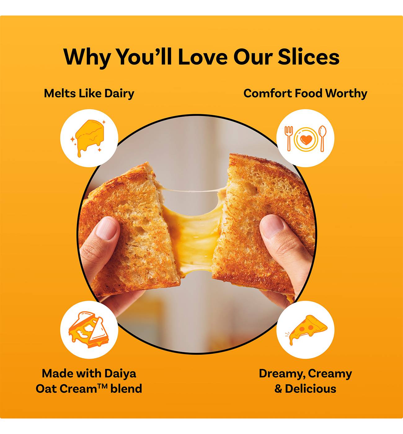 Is there any comfort food more iconic than cheese? Daiya's plant based cheese melts like dairy, tastes like dairy, and even looks like dairy...minus the actual dairy. They're reimagining the way plant based cheese is made, combining traditional cheesemaking methods with the goodness of oat. This new & improved dairy free cheese is now made with Daiya Oat Cream™ blend, for a cheesy, "melts-like-dairy" experience that comforts the way cheese should. Just like dairy cheese, these dairy free cheese slices can be enjoyed hot or cold. Smooth, creamy, and flavorful, these versatile slices are ready to top all your burgers and sandwiches with some cheesy perfection. Daiya dairy free American cheese slices are the perfect ingredient for your next grilled cheese sandwich or veggie burger. It's an instant classic and kitchen essential you'll reach for again and again. Buttery, creamy, and tangy, these slices are more like dairy than ever before.