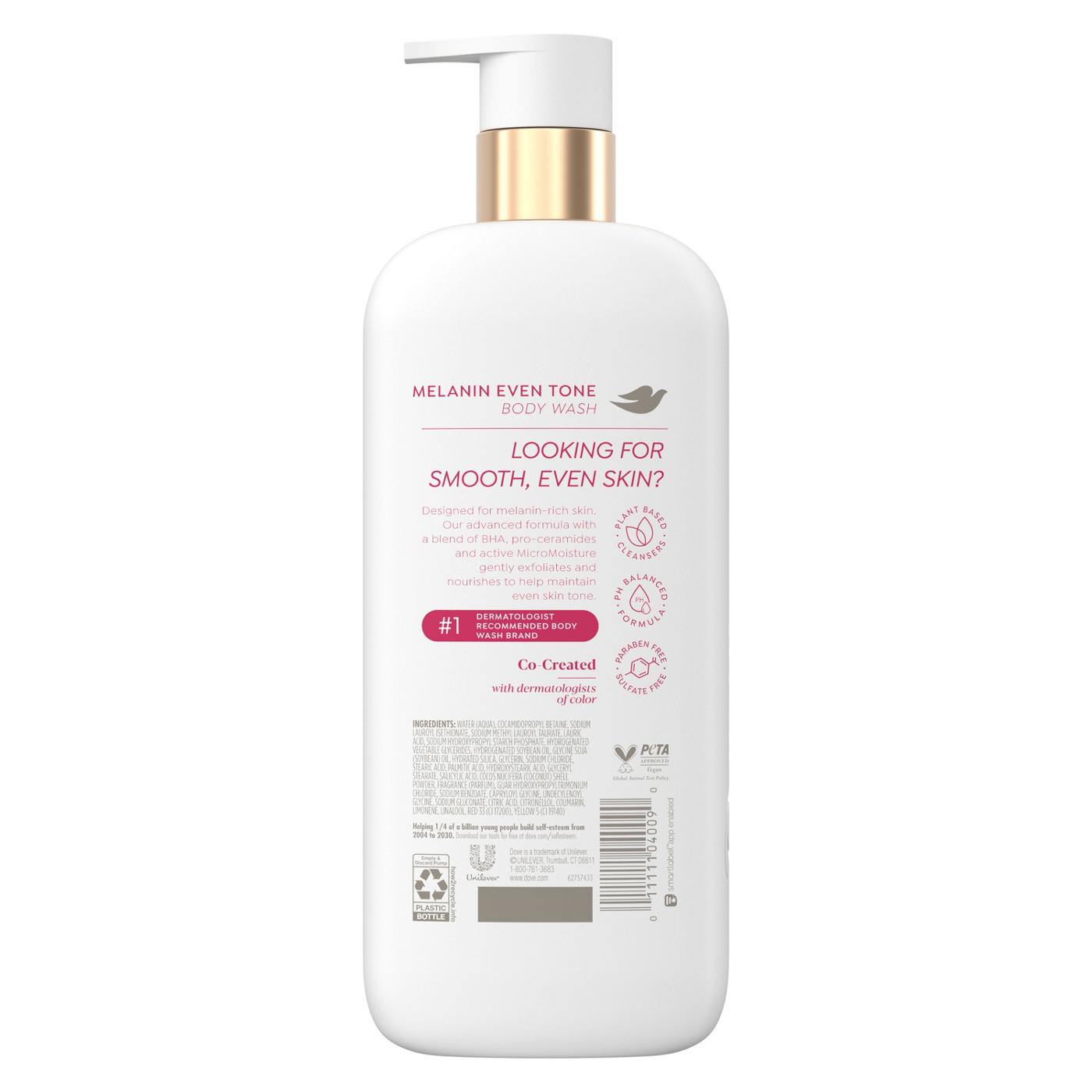 Looking for smooth, even skin? Dove Melanin Even Tone Body Wash, formulated with a 5% pro-ceramide serum with BHA gently exfoliates and nourishes to help maintain even skin tone. This rich exfoliating body wash transforms into a creamy lather, filling your shower with notes of mango and coconut. Has your skin been missing out? New Dove Serum Shower Collection is infused with active skin care ingredients to supercharge your body care routine. Quench thirsty skin with hydrating serum + hyaluronic acid, help prevent acne with acne clearing salicylic acid treatment, or recharge skin’s glow with brightening serum + vitamin C. Designed with you in mind, Dove's Melanin Even Tone Body Wash was co-created with board certified dermatologists of color to address the most common melanin-rich skin concerns, bringing expert care into your shower. The rich formula is also infused with pro-ceramides for stronger, more healthy-looking skin and BHA for smoother skin and even skin tone. Dove is the #1 Dermatologist recommended body wash brand. This cleanser is made with naturally-derived gentle skin cleansers, no sulfates or parabens and is PETA-certified vegan.