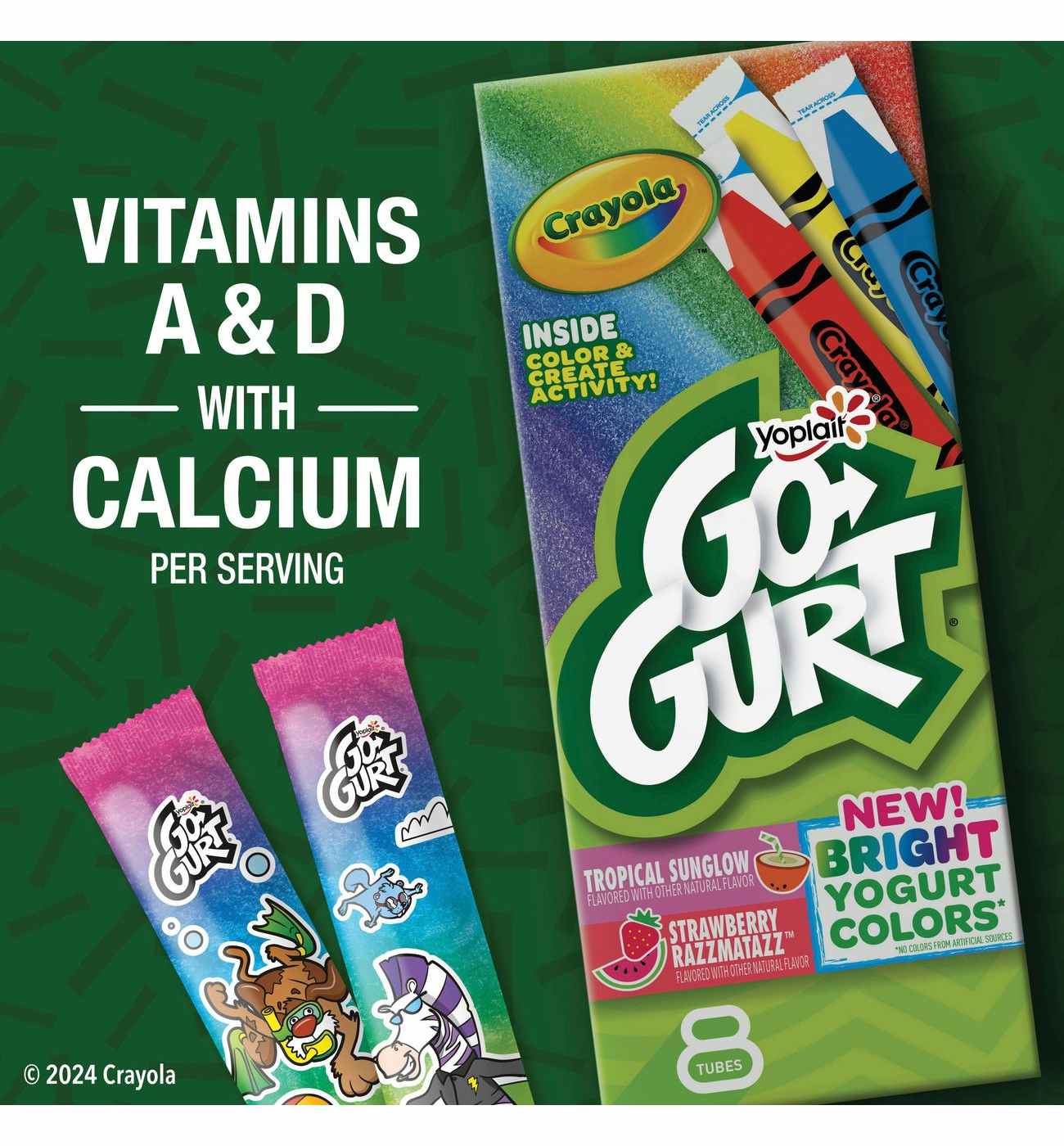 • CONTAINS: One box of 8 Yoplait Go-GURT Crayola Variety Pack Kids Fat Free Yogurt Tubes in Tropical Sunglow and Strawberry Razzmatazz flavors