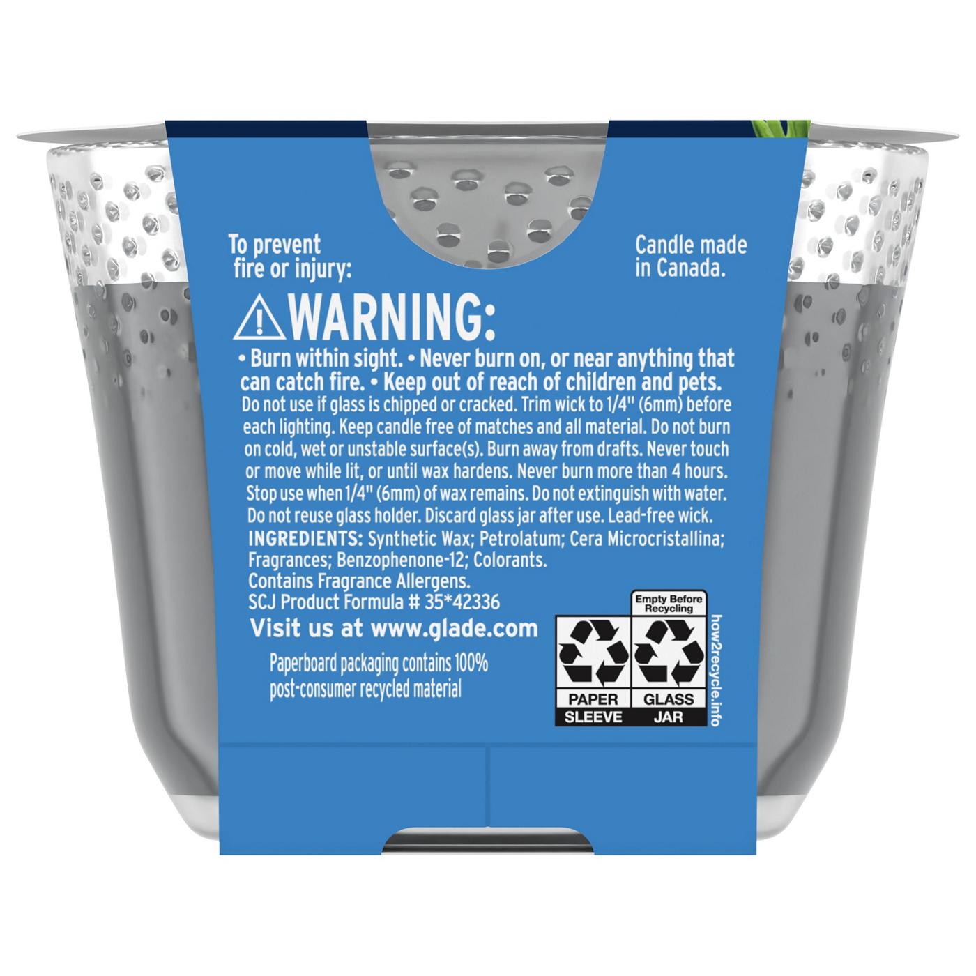 Feel your fresh when you light this Glade 3-wick candle made with Juniper & Teak fresh fragrances. Atmospheric elements of aromatic juniper and wind chilled air are complimented by notes of sparkling blood orange, providing a signal of outdoor freshness. Release your creative energy through the rich aromas of a candle made with fragrances infused with essential oils. Trim the candle wicks to 1/4-inch before lighting each time. Place the fragrance candle on a flat, heat-resistant surface and enjoy the flickering, warm glow and artfully layered scents. The 3-wick candle provides three times the glow versus a Glade single wick candle.