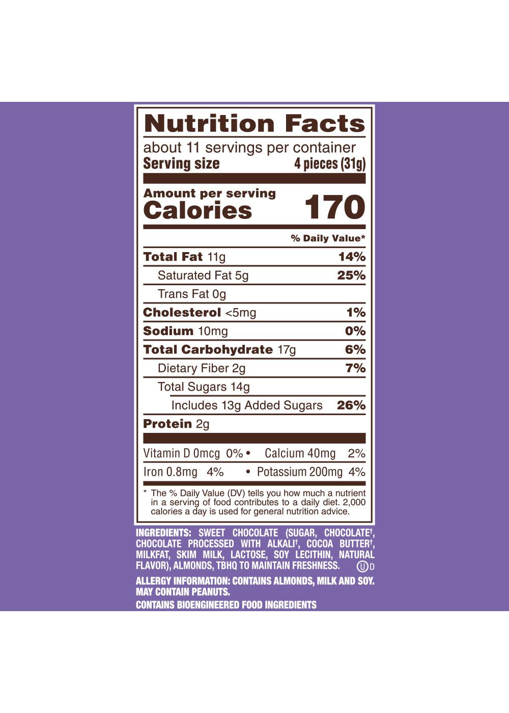 Sweet Chocolate (Sugar, Chocolate(a), Chocolate Processed with Alkali(a), Cocoa Butter(a), Milkfat, Skim Milk, Lactose, Soy Lecithin, PGPR, Natural Flavor), Almonds, TBHQ to Maintain Freshness. (a)Contains Rainforest Alliance Certified Cocoa.Allergens and safety warnings