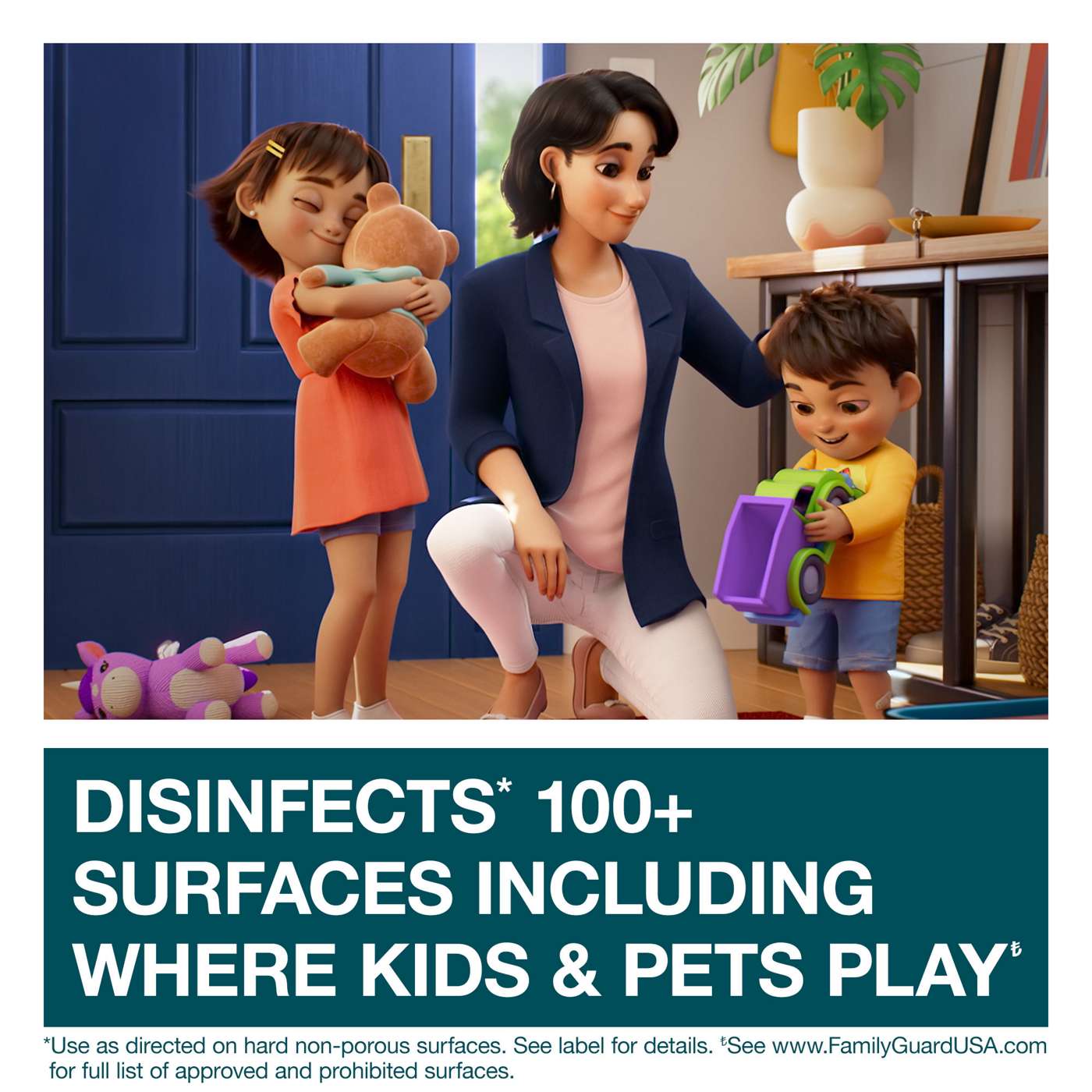 ills 99.9% of germs (Germs: Staphylococcus aureus (Stamp), Salmonella enterica, Listeria monocytogenes, Enterococcus faecalis, Escherichia coli (E. coli), Enterobacter aerogenes, Campylobacter jejuni, Pseudomonas aeruginosa, Trichophyton interdigitale (the fungus that causes athlete's foot)) & viruses (Viruses: Rotavirus, Respiratory Syncytial Virus (RSV), Influenza A (flu virus), Herpes Simplex Virus Type 1, Herpes Simplex Virus Type 2, Human Coronavirus, Parainfluenza A Virus Type 3, SARS-Cov-2). On hard, non-porous surfaces. Gentle enough on non-porous surfaces for daily disinfection. Use on 100+ surfaces including where kids & pets play. Dual purposes spray: deodorizes and disinfect. Disinfects the hard, non-porous surfaces your family touches the most. A spray you can see for coverage you can trust. Sanitizer: Kills staphylococcus aureus and klebsiella pneumonioe on hard, non-porous surfaces in 30 seconds.
