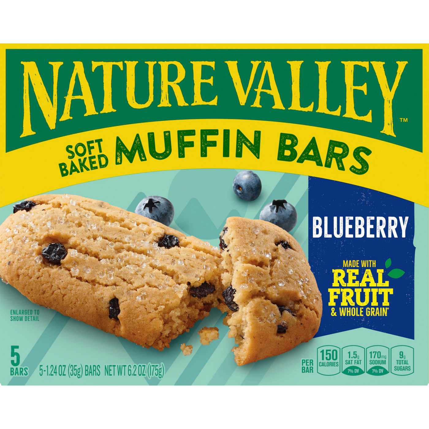 Muffin-soft goodness, to go. Get all the goodness of a soft muffin in a portable bar. For the morning wake-up call you'll crave. Nature Valley Blueberry Soft-Baked Muffin Bars are made with 8g of whole grain per serving (at least 48g recommended daily) and contain no artificial flavors, colors from artificial sources or high fructose corn syrup. A portable snack that's perfect for the pantry, lunch box, and hiking trail. It's a snack everyone in your household can enjoy. At Nature Valley, we believe that what you put in is what you get out. So wherever the moment takes you and your family, you can rely on our great-tasting snacks to help keep you going. Contains five bars.MUFFIN BARS: Nature Valley Blueberry Soft-Baked Muffin Bars provide the goodness of a soft muffin in a bar to-go; With wholesome ingredients for a breakfast snack, lunch box, or afternoon snack the entire family will enjoyMORNING SNACK: Wholesome snacks with 8g of whole grain per serving (at least 48g recommended daily).PERFECTLY PORTABLE: Individually wrapped bars for snack time or an on-the-go invigorating treat; Perfect as a part of breakfast, for the pantry, lunch box, and hiking trailQUALITY INGREDIENTS: Hearty whole grain with no artificial flavors, artificial colors, or high fructose corn syrupCONTAINS: One 6.2 oz box of Nature Valley Blueberry Soft-Baked Muffin Bars; 5 barsPERFECTLY PORTABLE: 5 individually wrapped bars. Muffins without the mess!