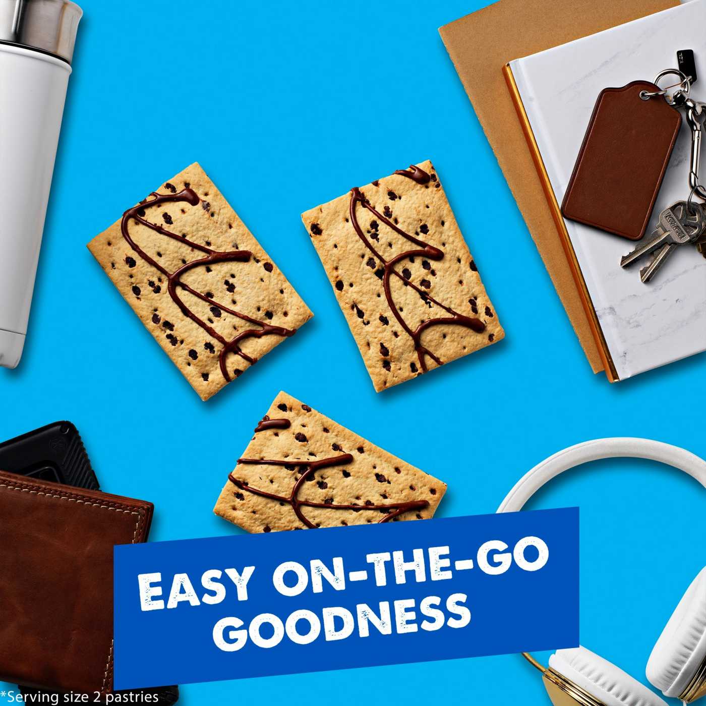Pop-Tarts Frosted Chocolate Chip Drizzle toaster pastries are a delicious treat to look forward to any time of day. Includes one, 13.5-ounce box of Chocolate Chip Drizzle Pop-Tarts. Jump-start your day with a sweet and decadent blast of gooey, chocolate-flavored filling encased in a chocolate chip pastry crust with chocolate drizzle frosting. It’s a quick and tasty anytime snack for the whole family; Pop-Tarts toaster pastries are an ideal companion for lunchboxes, after-school snacks, and busy, on-the-go moments. Not just for mornings, the versatile deliciousness of Pop-Tarts fits into your lifestyle just about anywhere there's time for a snack. Store them in your desk drawer for a pick-me-up at the office, keep them on hand in your pantry for a sweet after-dinner treat, or bring some in the car for a satisfying snack on the road. These toaster pastries also make welcome additions to care packages, goodie bags, and gift baskets. Just pop them in your toaster for a crisp, warm crust, heat them in the microwave, or enjoy them right out of the foil with a glass of ice-cold milk.• Start your day with tasty chocolate chip pastry crust with chocolate-flavored filling; A delicious morning treat that’s great for kids and adults• Soft chocolate chip toaster pastries with gooey chocolate-flavored filling on the inside and chocolate drizzle on the outside• Good source of three B vitamins; Contains wheat, milk, soy and egg ingredients• A travel-ready food perfect for lunchboxes, after-school snacks, and on-the-go moments; Enjoy from the pack or warm from the toaster or microwave• Includes one, 13.5-ounce box containing eight toaster pastries; four pouches total, two pastries per pouch; Packaged for freshness and great taste• SNAP and EBT eligible item