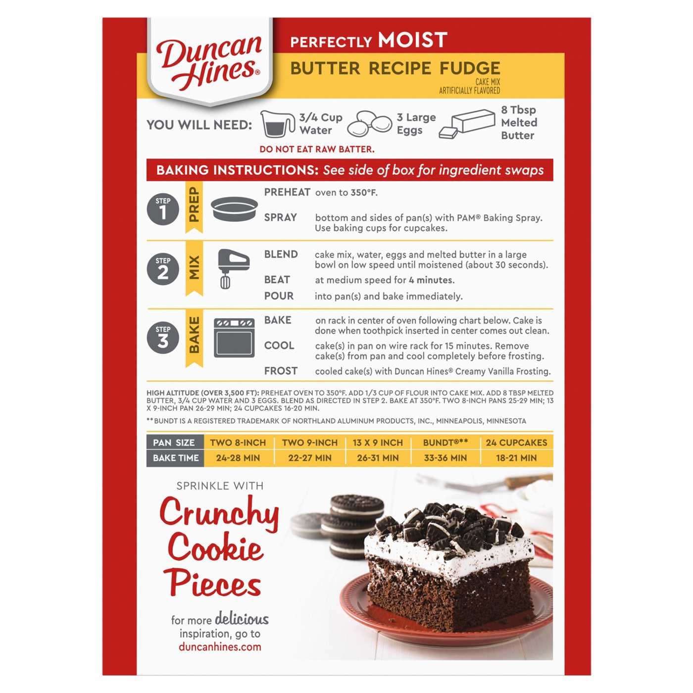 Duncan Hines Perfectly Moist Butter Recipe Fudge Cake Mix has buttery chocolate flavor in every bite that brings the taste your family adores to the table. Topping this fudge cake with your favorite Duncan Hines frosting will raise dessert time to the next level. This butter recipe cake mix can be prepared in many shapes and sizes; use it for chocolate birthday cake, sheet cake or cupcakes. Baking your next creation is easy. Just add water, eggs and butter, then mix and pour into your pan, following the baking time for your pan's size and shape. Each box makes one 13 by 9 inch chocolate cake or 24 cupcakes. From a traditional layer cake to single serve desserts, Duncan Hines has you covered when you’re ready to bake and create.