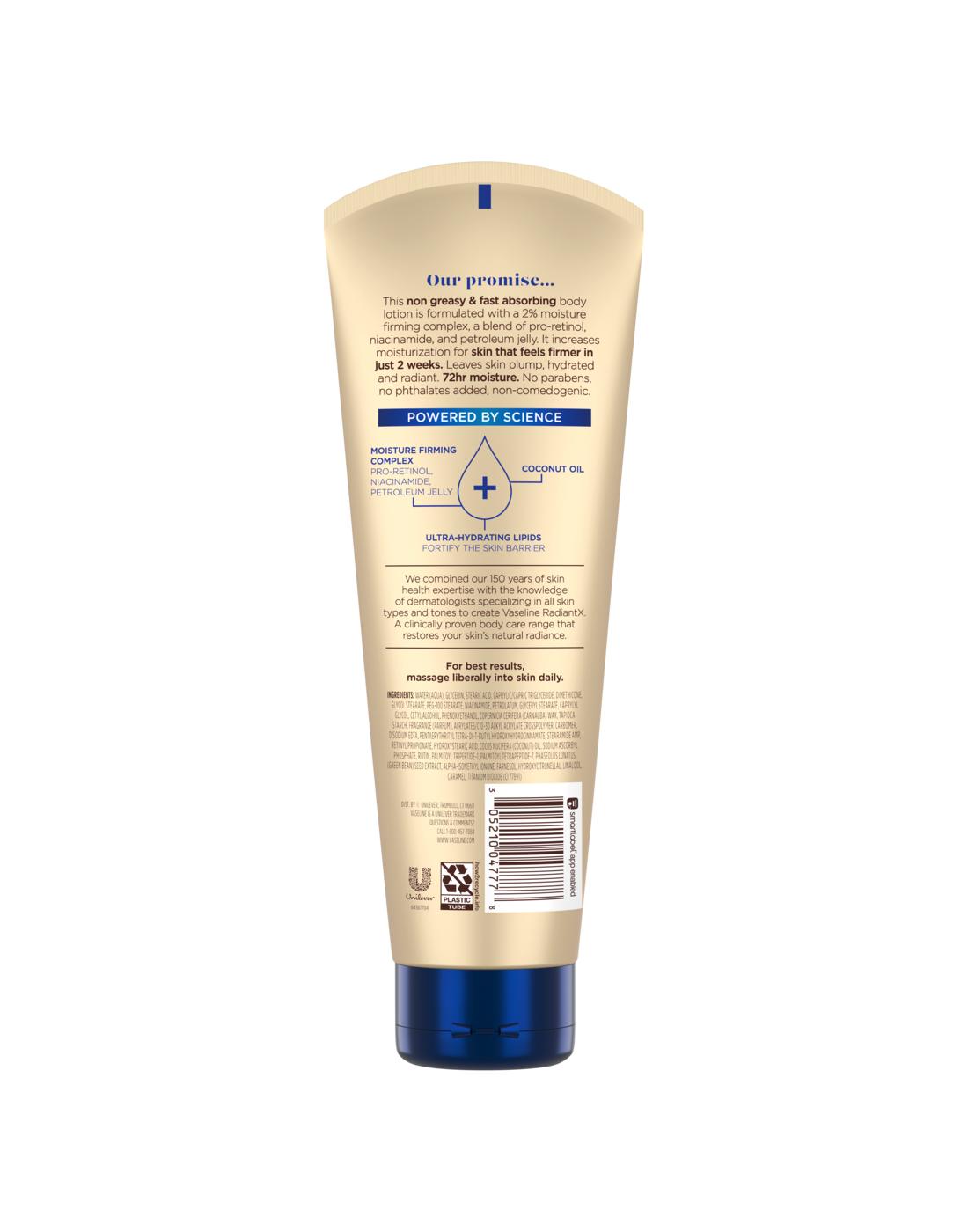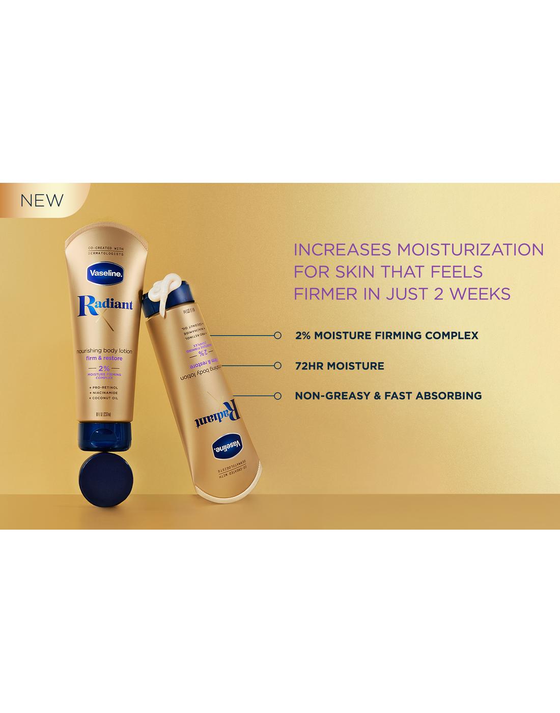 • CLINICALLY PROVEN: Vaseline® Radiant X Firm & Restore is a fast-absorbing body lotion with 2% Moisture Firming Complex to increase moisturization, leaving skin feeling firmer in just 2 weeks.