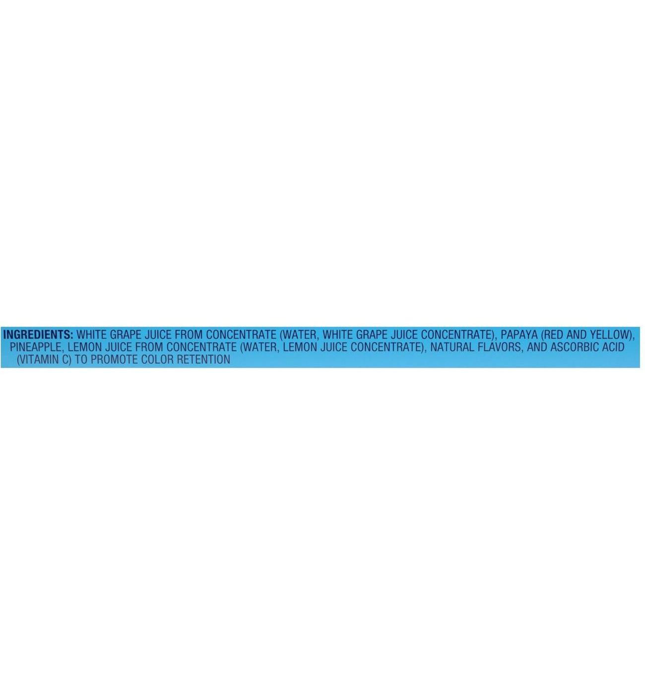 Papaya (Red and Yellow), White Grape Juice from Concentrate (Water, White Grape Juice Concentrate), Pineapple, Acerola Juice from Concentrate (Water, Acerola Juice Concentrate), Lemon Juice from Concentrate (Water, Lemon Juice Concentrate), and Natural Flavors.