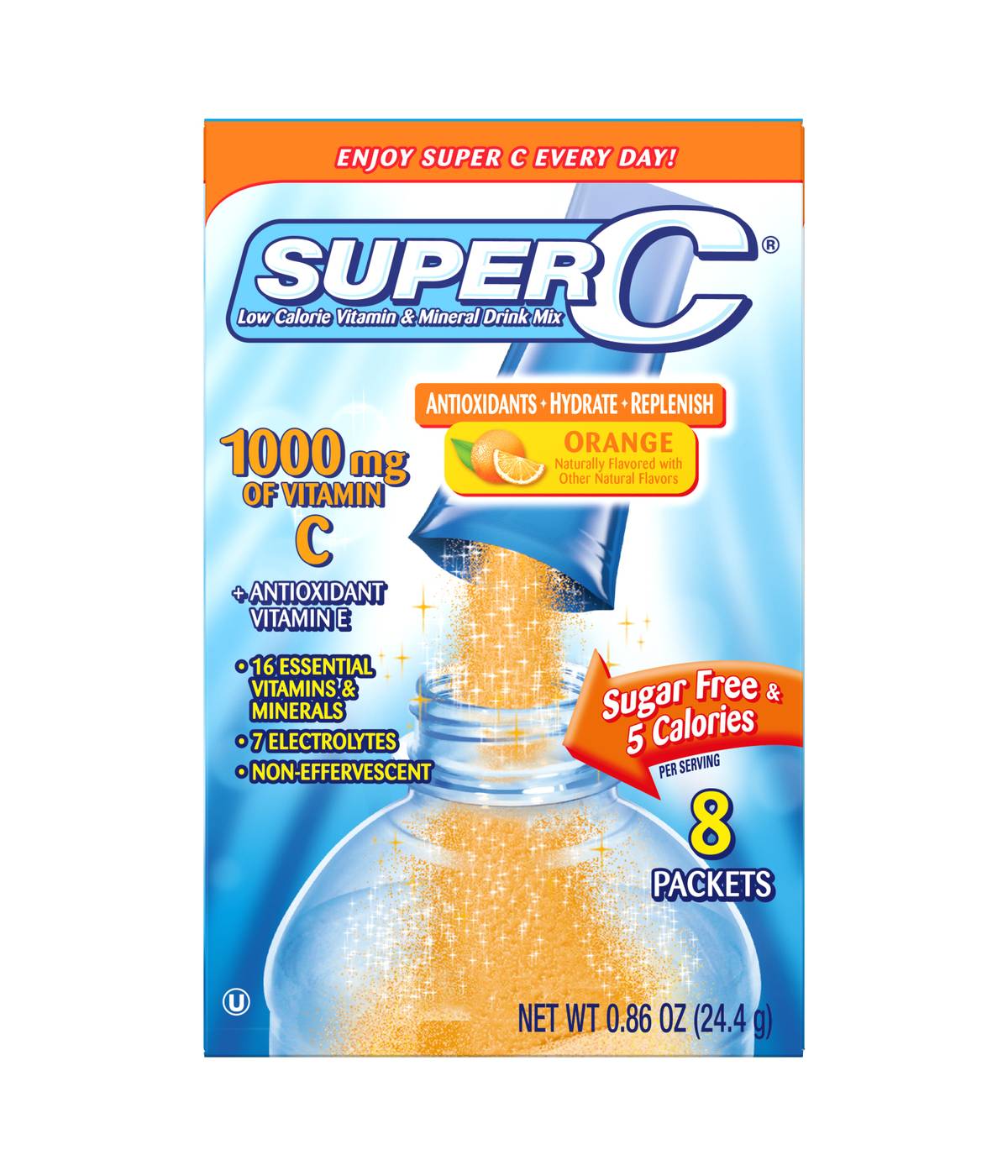 If getting your family to drink enough water and getting the right vitamins is a chore, Super-C drink mix can make hydration taste great! With just 5 calories per packet and no sugar, Super-C drink mix is a better choice than most soft drinks and come in a wide variety of flavors. Super-C singles to go are an excellent source of vitamin C. Fill your tumbler with water or sip from your water bottle, leaving room for your powder stick. Pour one stick for every 16.9oz of water into your favorite tumbler or water bottle. Mix to taste (more water equals milder flavor). Mix well until powder dissolves.