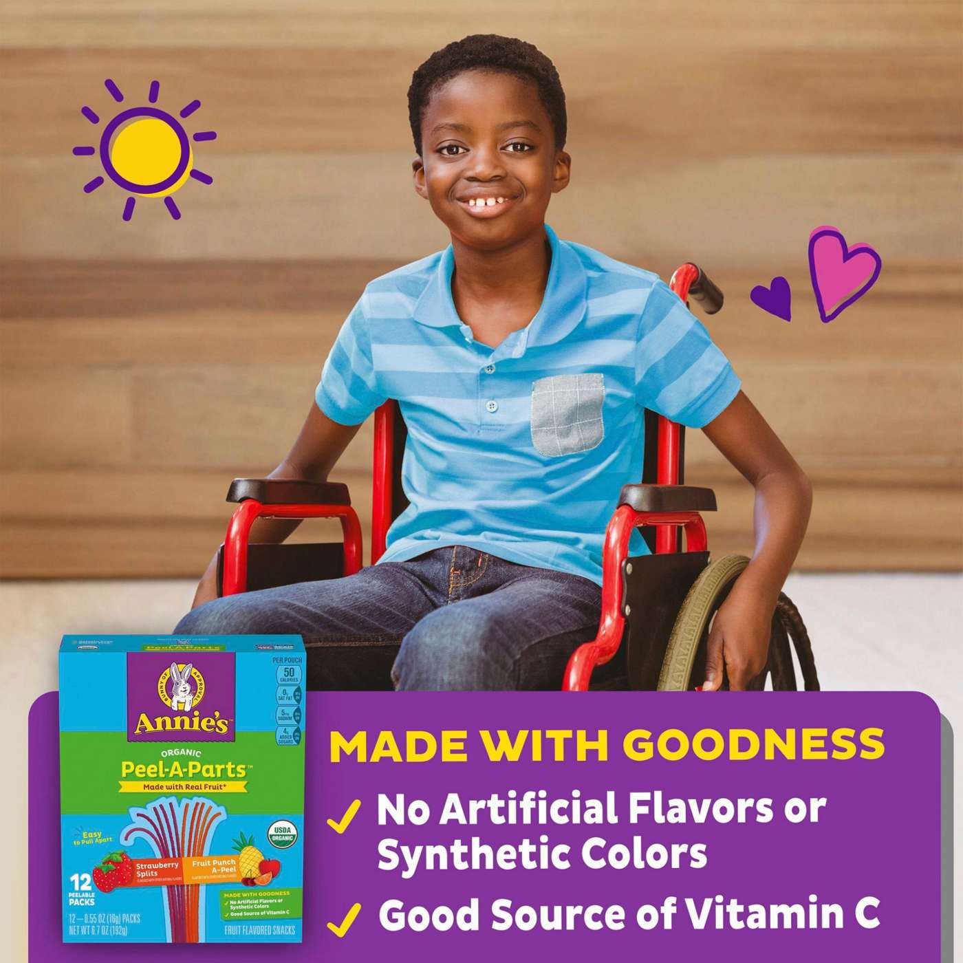 Annie's Organic Fruit Peel-A-Parts Fruit Flavored Snacks in Strawberry Splits and Fruit Punch A-Peel flavors are fun and delicious! Each fruit flavored snack packs strawberry and fruit punch flavor into whimsical, easy-to-peel gummy strips. These vegan, gluten free, fruit flavored snacks turn snack time into a fun adventure. The best part? The gummies are made with certified organic ingredients for ultimate wholesome yumminess. Plus, they contain real fruit juice*, have no artificial flavors or synthetic colors, and are a good source of vitamin C. Everybody in your family can enjoy the fruity flavors of Annie's tasty fruit flavored snacks. Annie's makes products in over 20 family-friendly categories, from fruit flavored snacks and cereal to mac and cheese. For busy bunnies and families on the go, we help make life a little easier and more delicious by spreading goodness through tasty foods and kindness to the planet. *These fruit flavored snacks are made with organic apple puree concentrate. See nutrition panel on label for a complete list of ingredients. They are not intended to replace fruit or vegetables in the diet.FRUIT FLAVORED STRINGS: Made with real fruit juice* for yummy strawberry and fruit punch flavors; *Made with organic pear juice concentrate and not intended to replace fruit or vegetables in the diet (See nutrition label for complete ingredients)WHOLESOME INGREDIENTS: No artificial flavors, synthetic colors or high fructose corn syrup for added goodnessCERTIFIED ORGANIC: Made with certified organic ingredients for the goodness you'd expect from Annie's snacksVEGAN SNACK: Organic fruit flavored snacks are vegan, gelatin free and gluten freeCONTAINS: One 6.7 oz Variety Pack of Annie's Organic Strawberry and Fruit Punch Fruit Peel-A-Parts Fruit Flavored Snacks; 12 countBOX TOPS FOR EDUCATION PARTICIPATING PRODUCT: Give back to schools with Annie's; Download the Box Tops App to learn more & start earning cash for your school or a school in need