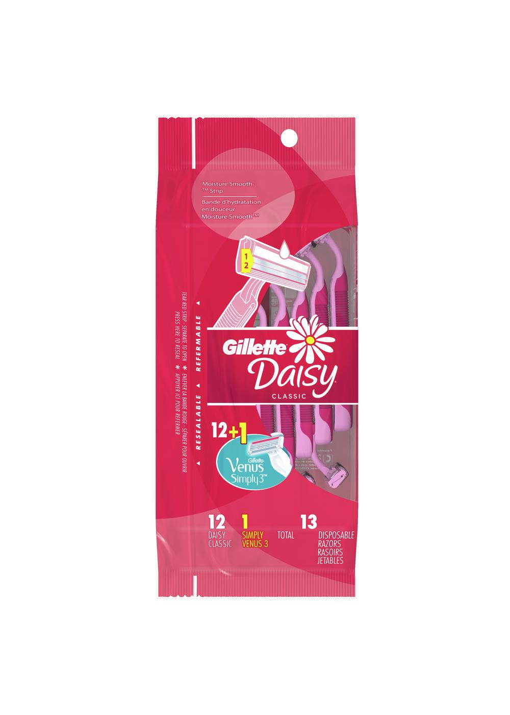 Daisy Classic disposable razors for women have comfort blades, a moisture-smooth strip, and comfort handle to give you a close shave. Gillette comfort razor blades are thin to glide effortlessly for a smooth shave and the comfort handle is designed for a secure grip. Each package contains 2 Daisy Classic pink women's disposable razors.