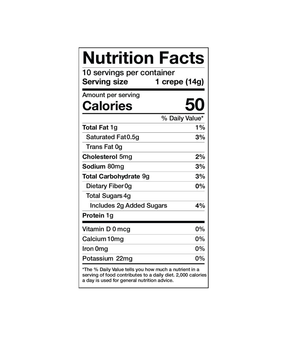 These delicious pre-made crêpes are ready to be devoured straight out of the package but are so much better with fixings! Light, delicate and slightly sweet they are perfect for anything from appetizers to desserts. You'll love filling them with fresh berries, fruit, or chocolate hazelnut spread for a delightful treat. Special occasion? Just stack between layers of whipped cream and preserves to make a crêpe cake that will satisfy any sweet tooth. Feelin' something savory? No problem, just stuff with cheese, veggies, meats, and top with a flavorful sauce.