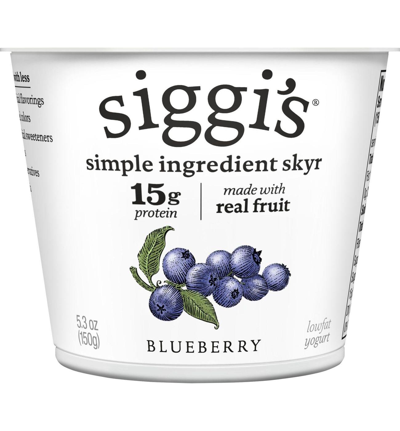 siggi's Blueberry Icelandic-Style Nonfat Strained Yogurt is an ode to a deeply rooted Scandinavian dairy tradition that has been a part of Icelandic culture for centuries. siggi's founder wasn't thrilled with the overly sweet and artificial taste of other US yogurt brands, inspiring him to create yogurt crafted with less. Each cup of siggi's nonfat skyr uses 4x the amount of milk than a regular cup of yogurt — making it rich in protein. siggi's skyr is thick and creamy — ideal as a nonfat addition to breakfast, a nutritious snack, or an easy afternoon pick-me-up. Pair with your favorite toppings, like fresh berries and granola, or enjoy as is. Our nonfat blueberry yogurt cups contain 5 simple ingredients including real fruit and no artificial anything. Gluten-free and kosher, if you like our strained blueberry yogurt, try our full line of products, including skyr, drinkable yogurt, plant-based blends, and yogurt pouches.