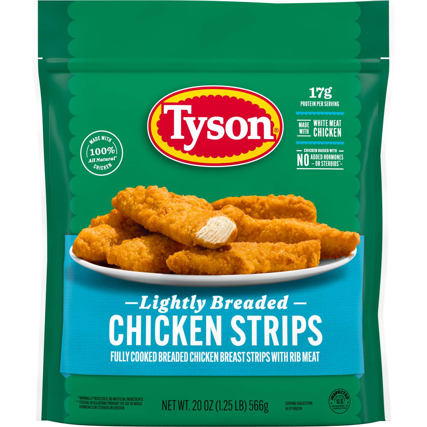 Tyson® Simple Ingredient Boneless Chicken Strips, Fully Cooked Frozen Appetizers deliver premium taste with everyday convenience. Each 20 oz resealable pack features all white meat chicken, lightly breaded for a crispy, golden texture. With 20 grams of protein per 3 oz serving, these strips make satisfying appetizers, snacks, or a quick family dinner. Made with simple, 100% all natural* ingredients and flavorful seasoning, they heat easily in the air fryer, oven, or microwave for delicious results in minutes. The resealable bag helps preserve freshness and makes portioning simple. Minimally processed with no artificial ingredients, hydrogenated oils, added MSG or preservatives, these chicken strips deliver Tyson® trusted quality in every serving. Pure simplicity, unmistakable taste. *Minimally processed, no artificial ingredients.