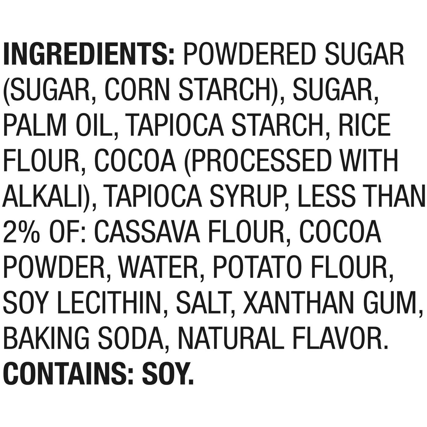 Powdered Sugar (Sugar, Corn Starch), Sugar, Palm Oil, Tapioca Starch, Rice Flour, Cocoa (Processed with Alkali), Tapioca Syrup, Less than 2% of: Cassava Flour, Cocoa Powder, Water, Potato Flour, Soy Lecithin, Salt, Xanthan Gum, Baking Soda, Natural Flavor.