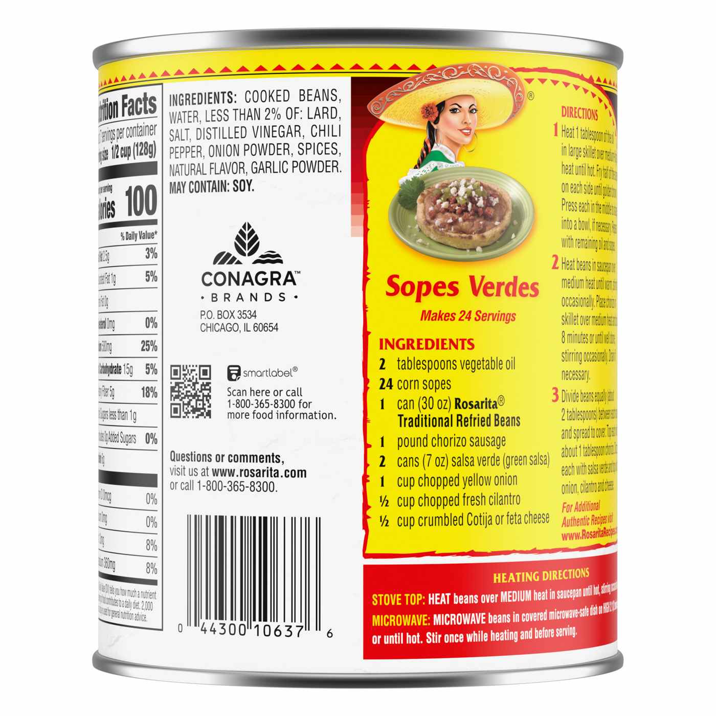 For over 70 years Rosarita has continued to make delicious Mexican sauces, beans, and refried beans. With Rosarita Traditional Refried Beans, you can give your family a delicious Mexican-style meal. Add Rosarita original-recipe, Mexican-style refried beans for authentic and delicious Mexican-style dishes and sides. On the stovetop, heat the beans over medium heat in a saucepan until hot, stirring occasionally or microwave in a covered microwave-safe dish on high for two and one-half minutes or until hot. When it comes to your family's Mexican food night, serve them the taste of true Mexican heritage with Rosarita. Rosarita Traditional Refried Beans have 110 calories per serving with zero grams trans fat.