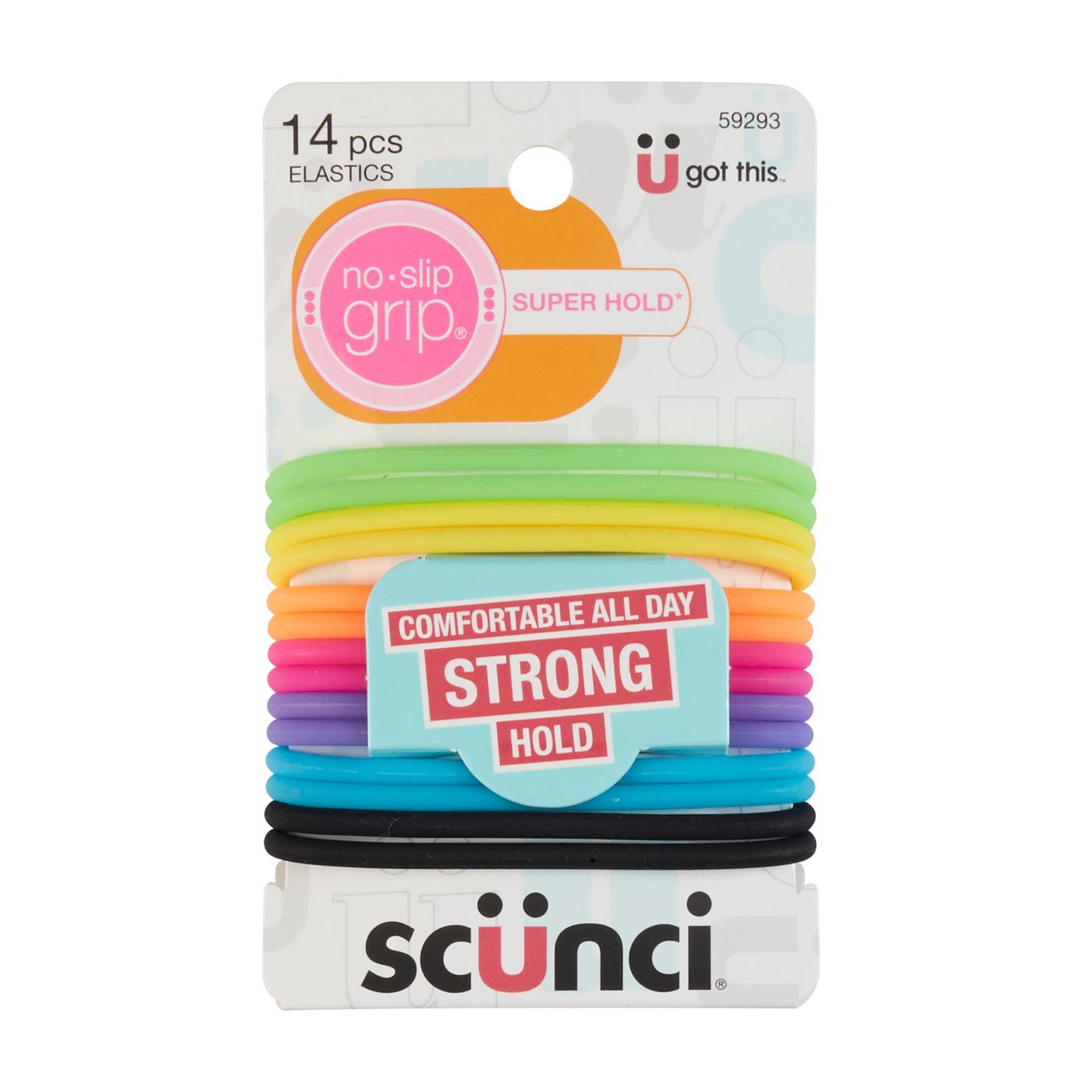 These Scunci No-Slip Grip Gel Elastics provide a reliable hold for your hairstyles. This assortment includes hair ties in several bright gel colors as well as classic black. The integrated no-slip grip ensures your hair stays in place, making them a functional choice for daily wear.• Integrated no-slip grip for a secure, lasting hold• Smooth gel construction glides through hair• Includes an assortment of bright colors and black• Strong hold suitable for active use