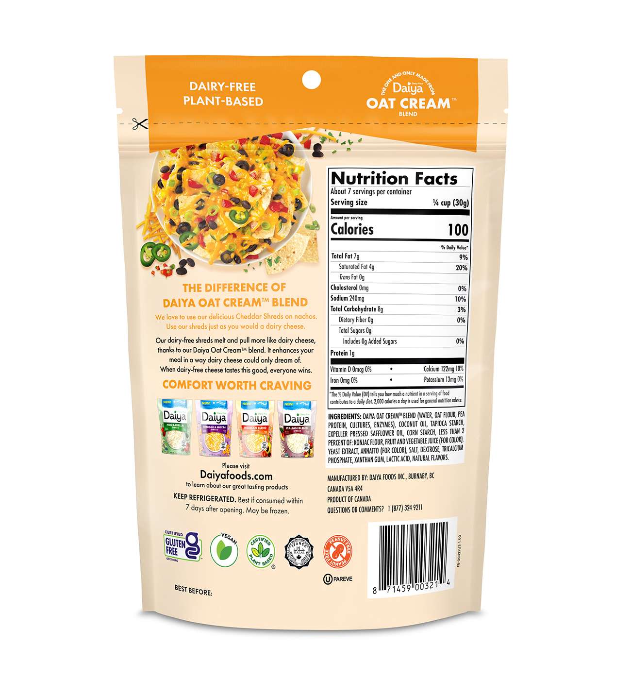 Daiya Oat Cream Blend (Water, Gluten-Free Oat Flour, Pea Protein, Cultures, Enzymes), Tapioca Starch, Coconut Oil, Corn Starch, Expeller Pressed Safflower Oil, Calcium Phosphate, Less than 2 Percent of: Konjac Flour, Fruit and Vegetable Juice (for Color), Yeast Extract, Annatto (for Color), Salt, Dextrose, Xanthan Gum, Lactic Acid, Natural Flavors.