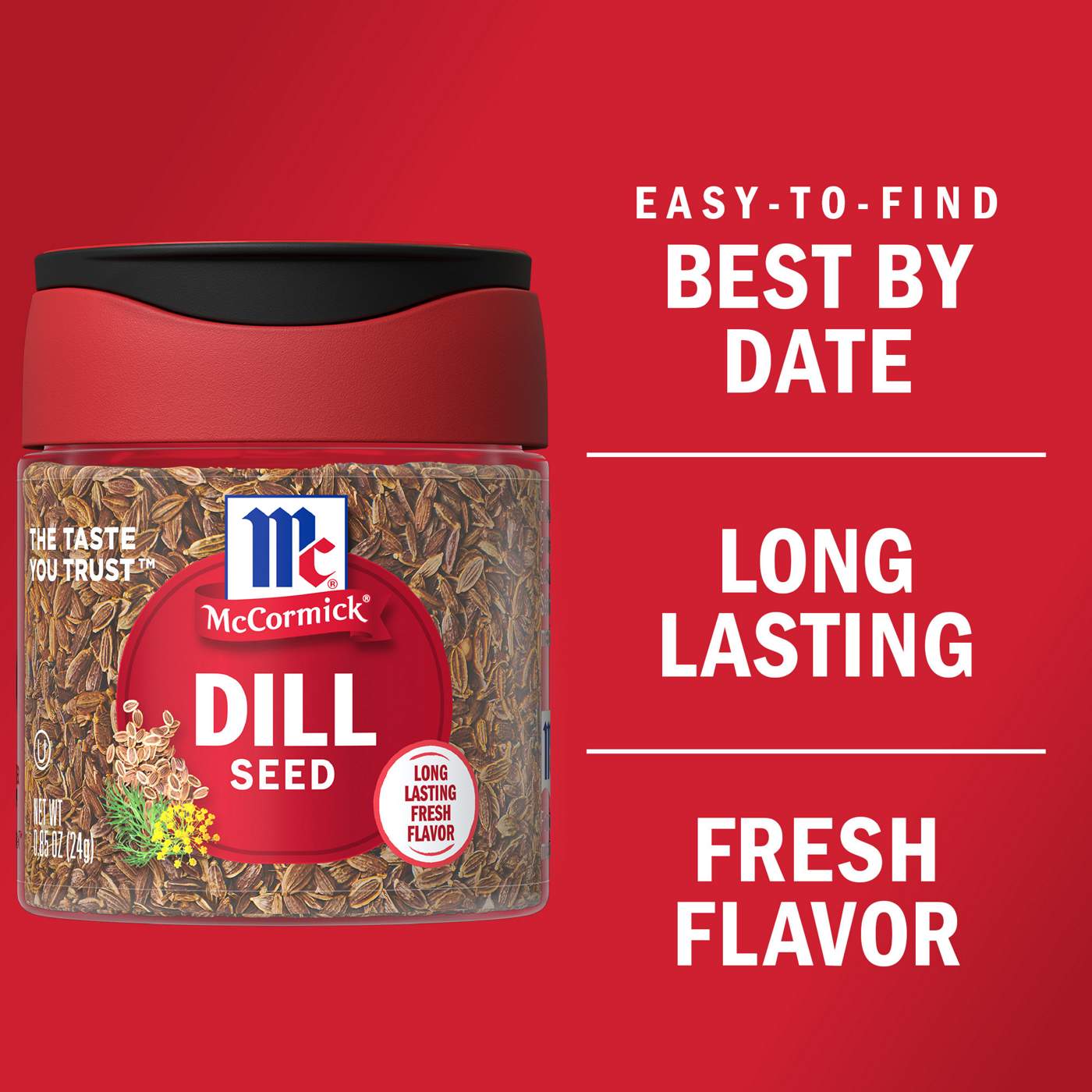 Dill seed is the fruit of the dill plant, from which we also get the herb, dill weed, which are the feathery leaves. More aromatic than the herb, the seeds are used whole or crushed to add bright, lemony flavor to pickles, savory pork and seafood recipes, and salads. At McCormick® our whole dill seeds are hand-picked for robust, tart flavor. Popular in Scandinavian & Eastern European cooking, its caraway-like taste enhances bread, potato and noodle dishes, as well as soups and stews. An ingredient in pickling spices, dill the defining flavor in pickles and can be used to prepare other pickled vegetables, relishes and sauerkraut. The seed also appears in Indian dals and curries where it is dry toasted or warmed in oil to release its aroma.- McCormick Dill Seeds are hand-picked for robust, tart flavor- An aromatic spice from the same plant that produces the herb, dill weed- For dill pickles, other pickled vegetables, relishes and sauerkraut- Popular in Scandinavian, Eastern European and Indian cooking- Caraway-like taste enhances bread, potato and noodle dishes- Paired with dill weed in salad dressings and vinegars- SnapTight™ bottles keep flavor and aroma sealed in- Non GMO