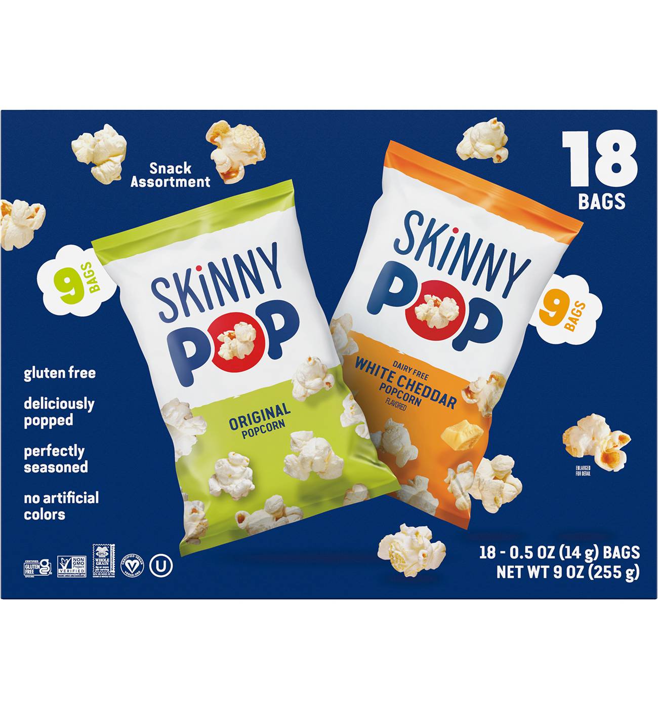 Made with the fewest, cleanest and simplest ingredients possible to bring you the best tasting popcorn, this SKINNYPOP multipack includes 9 bags of Original and 9 bags of Dairy-Free White Cheddar. They're convenient and delicious for snacking and also for packed lunches.