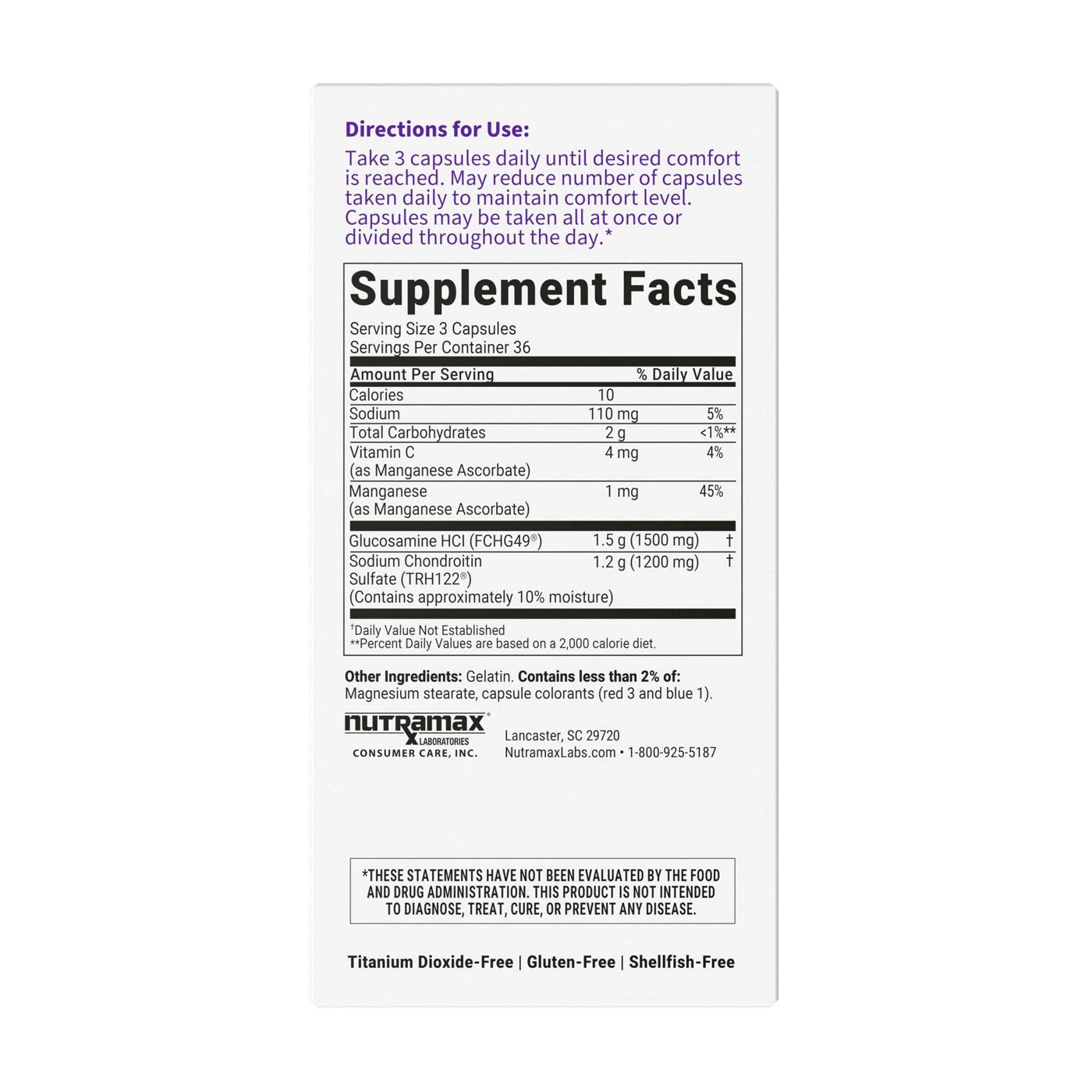 Active Ingredients: Glucosamine HCl Sodium Chondroitin Sulfate, Manganese, Vitamin C, Other Ingredients: Gelatin. Contains Less than 2% of: Magnesium Stearate, Titanium Dioxide (Capsule Color), Red 3, and Blue 1Allergens and safety warnings
