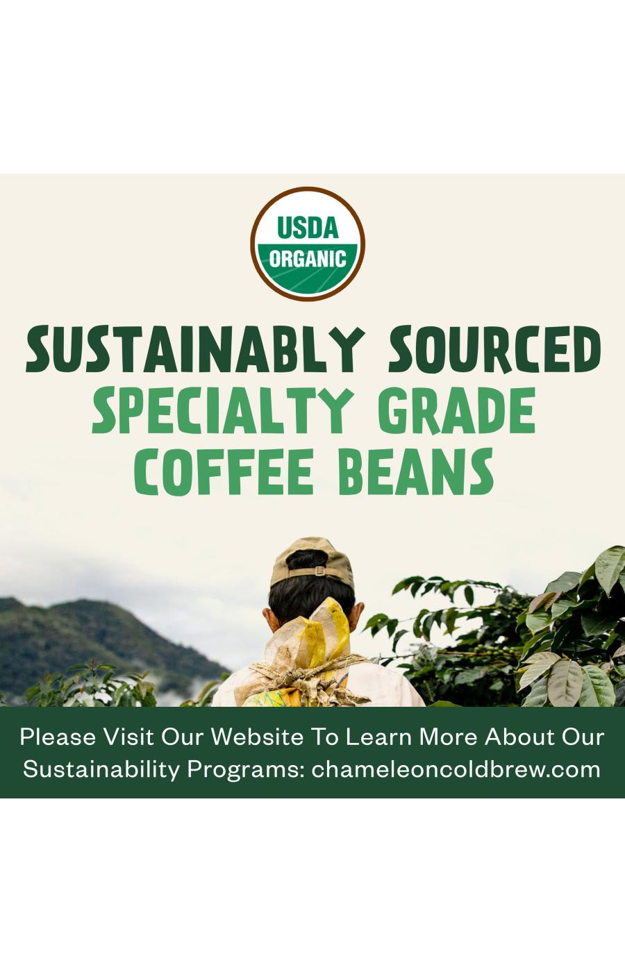 Chameleon Organic Cold Brew Concentrate Black Coffee raises your coffee standards with the dark, bold flavor of smooth black coffee. Made from specialty-grade, sustainably sourced coffee beans, each batch of this organic coffee is expertly crafted to deliver low acid, super smooth coffee every time. This coffee drink concentrate contains 15 calories per serving. Chameleon cold brew coffee concentrate comes in a glass bottle with an easy-to-open screw top for convenience, just mix whenever you want a more robust cold coffee, or mix and pour it over ice for easy iced coffee. Each bottle of Chameleon coffee comes ready to mix with no brewing required. Ready, set, cold-brew!