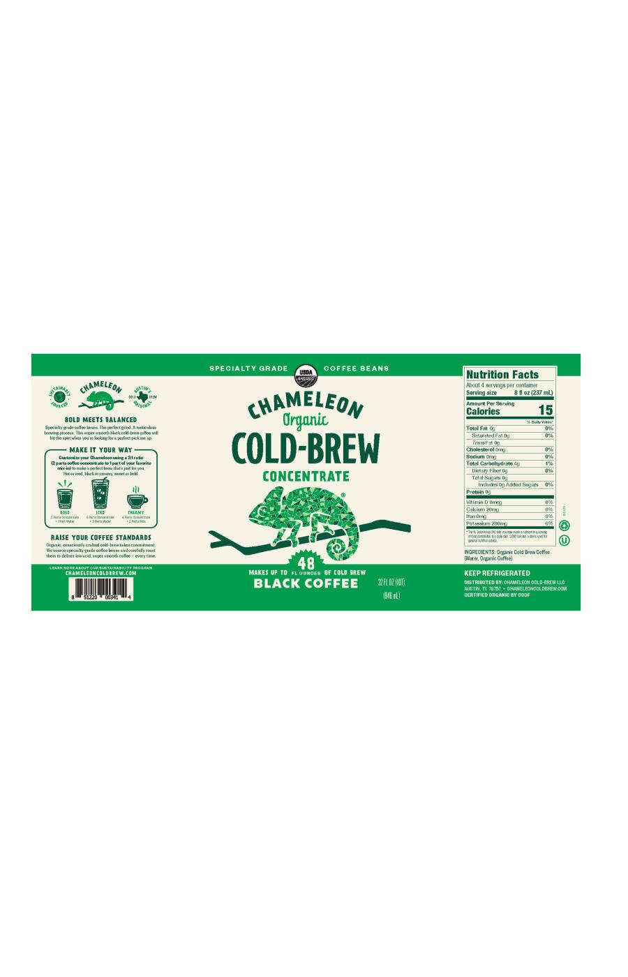 • One 32 fl oz bottle of Chameleon Organic Cold Brew Concentrate Black Coffee • This cold brew features the dark, bold flavor of smooth black coffee • Mix and pour over ice for convenient iced coffee • Each serving contains 15 calories • Serve chilled for a delicious way to start your day • Convenient screw cap for easy opening and secure storage