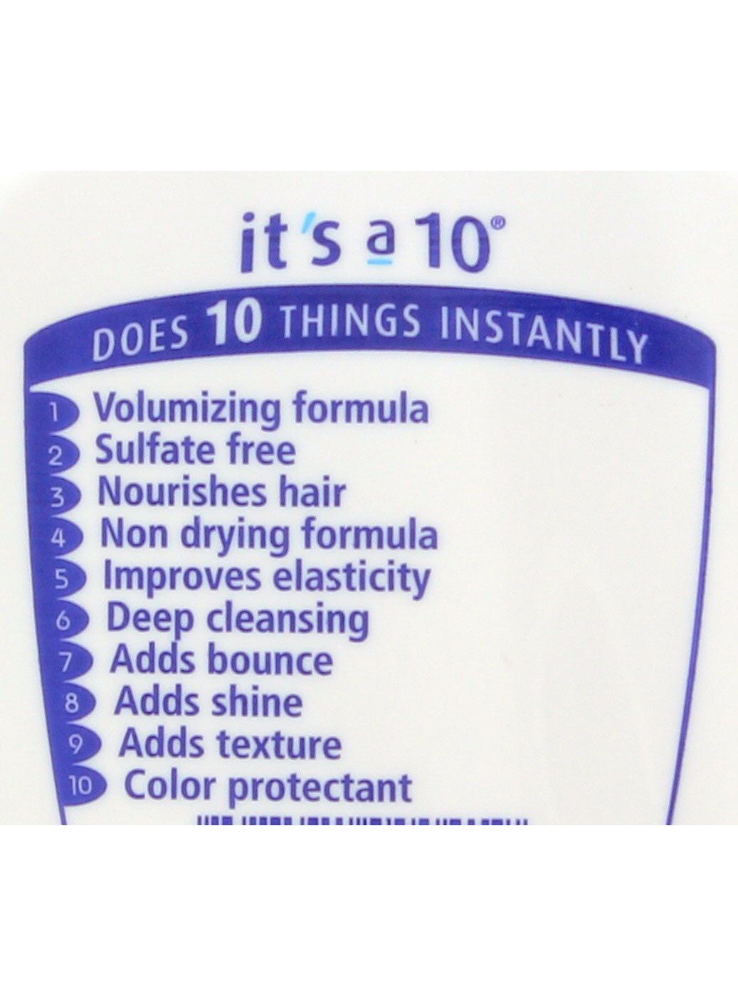 It's a 10 Miracle Volumizing Shampoo features a professional-quality, sulfate-free formula that adds body and fullness without weighing hair down. It provides a gentle cleanse that helps to remove buildup, leaving hair feeling light and airy. This shampoo is designed to create an ideal foundation for voluminous styles.• Lightweight formula adds body and volume• Gently cleanses to remove residue and buildup• Leaves hair feeling full and airy• Professional-quality, sulfate-free formulation