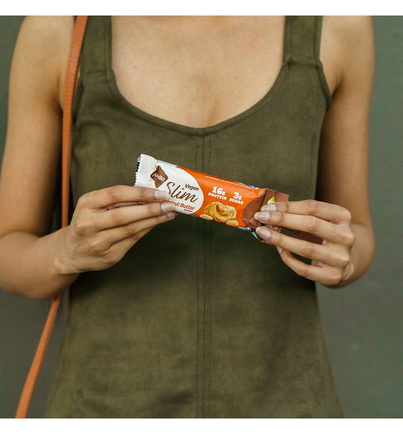 Unlike anything else! Indulge in the classic pairing of crunchy peanut butter and decadent real dark chocolate, all with just 3g sugar and absolutely no artificial sweeteners or Maltitol. NuGo Slim Crunchy Peanut Butter is crafted with 16g plant protein in each delicious bar. Certified vegan and gluten-free, it's low sugar snacking, reimagined.