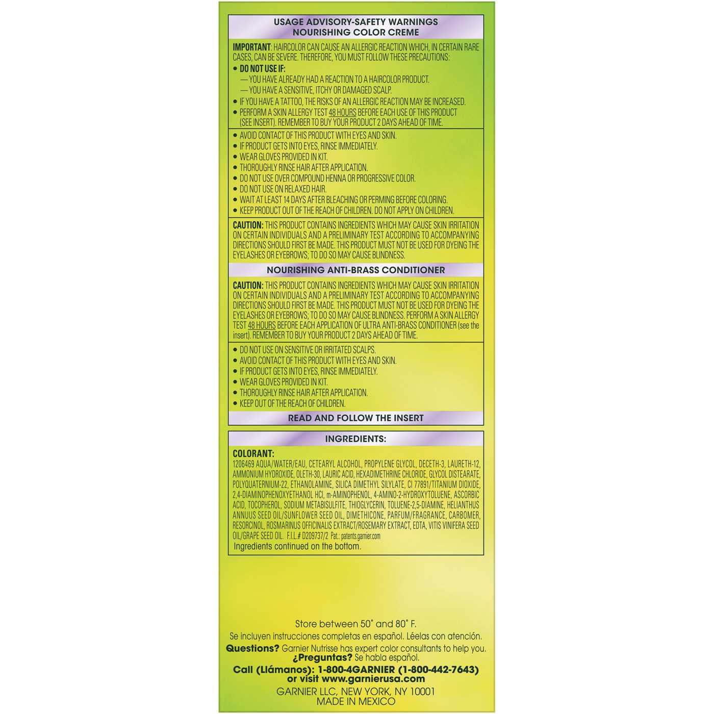 Colorant: Aqua/Water/Eau, Cetearyl Alcohol, Propylene Glycol, Deceth-3, Laureth-12, Ammonium Hydroxide, Oleth-30, Lauric Acid, Hexadimethrine Chloride, Glycol Distearate, Polyquaternium-22, Ethanolamine, Silica Dimethyl Silylate, Parfum/Fragrance, Pentasodium Pentetate, Sodium Metabisulfite, Carbomer, Ascorbic Acid, Vitis Vinifera Seed Oil/Grape Seed Oil, CI 77891/Titanium Dioxide, Toluene-2,5-Diamine, Resorcinol, M-Aminophenol, 2,4-Diaminophenoxyethanol HCl, 4-Amino-2-Hydroxytoluene, Dimethicone, Thioglycerin. Fruit Oil Concentrate: Paraffinum Liquidum/Mineral Oil/Huile Minerale, Vitis Vinifera Seed Oil/Grape Seed Oil, Parfum/Fragrance, Tocopherol, Rosmarinus Officinalis (Rosemary) Extract. Rinse-Out Conditioner: Aqua/Water/Eau, Cetearyl Alcohol, Elaeis Guineensis Oil/Palm Oil, Behentrimonium Chloride, Pyrus Malus Extract/Apple Fruit Extract, Glycerin Parfum/Fragrance, Stearamidopropyl Dimethylamine, Niacinamide, Pyridoxine HCl, Butyrospermum Parkii Butter/Shea Butter, Citric Acid, Olea Europaea Oil/Olive Fruit Oil, Saccharum Officinarum Extract/Sugar Cane Extract/Extrait de Canne a Sucre, Benzyl Alcohol, Chlorhexidine Dihydrochloride, Persea Gratissima Oil/Avocado Oil, Ribes Nigrum Oil/Black Currant Seed Oil, Linalool, Citrus Medica Limonum Peel Extract/Lemon Peel Extract, CI 19140/Yellow 5, Camellia Sinensis Extract/Camellia Sinensis Leaf Extract, CI 15985/Yellow 6. Developer: Aqua/Water/Eau, Hydrogen Peroxide, Cetearyl Alcohol, Trideceth-2, Carboxamide MEA, Ceteareth-25, Glycerin, Pentasodium Pentetate, Sodium Stannate, Tetrasodium Pyrophosphate, Phosphoric Acid.Allergens and safety warnings