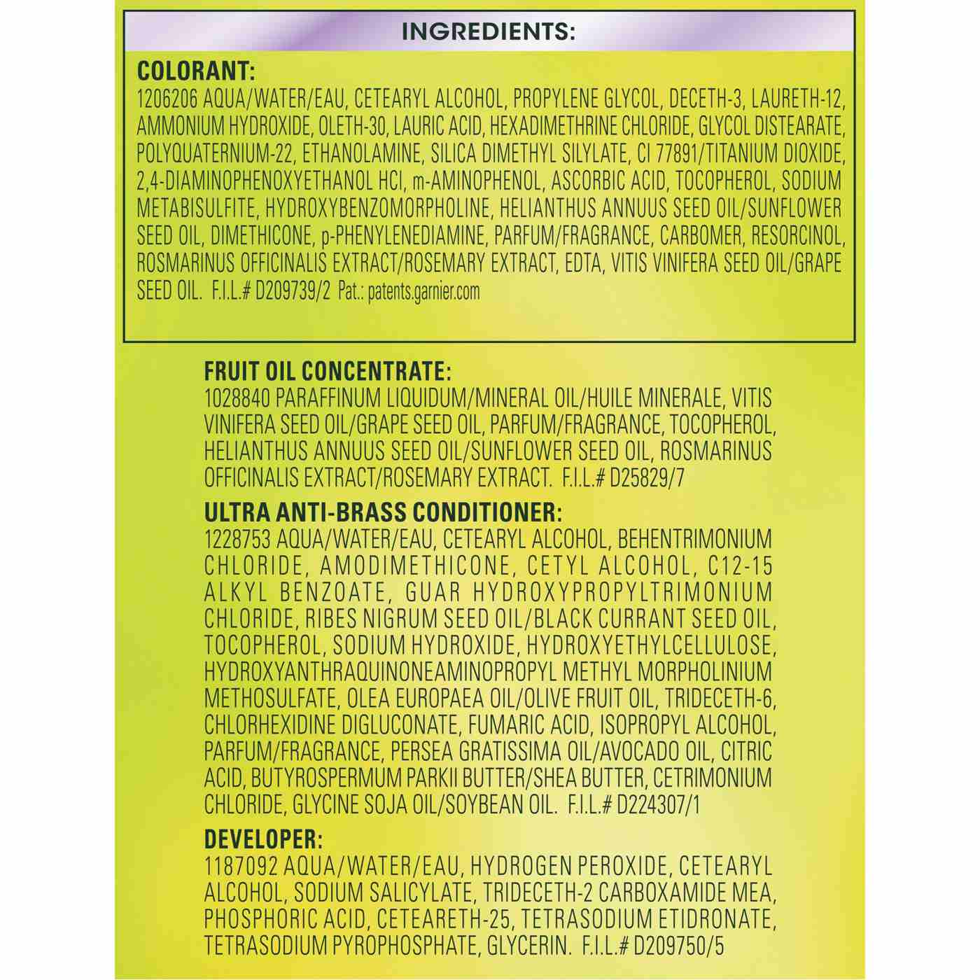 Colorant: 1126395 Aqua/Water/Eau, Cetearyl Alcohol, Propylene Glycol, Deceth-3, Laureth-12, Ammonium Hydroxide, Oleth-30, Lauric Acid, Hexadimethrine Chloride, Glycol Distearate, Polyquaternium-22, Ethanolamine, Silica Dimethyl Silylate, Parfum/Fragrance, Pentasodium Pentetate, Sodium Metabisulfite, Carbomer, Ascorbic Acid, Vitis Vinifera Seed Oil/Grape Seed Oil, Ci 77891/Titanium Dioxide, M-Aminophenol, Toluene-2,5-Diamine, P-Aminophenol, Resorcinol, 4-Amino-2-Hydroxytoluene, N,N-Bis(2-Hydroxyethyl)-P-Phenylenediamine Sulfate, 2,4-Diaminophenoxyethanol Hcl, Dimethicone, Thioglycerin, Tocopherol, Helianthus Annuus Seed Oil/Sunflower Seed Oil, Rosmarinus Officinalis (Rosemary) Extract. F.I.L.# D178237/1 Us Patent: 5,690,696 Fruit Oil Concentrate: 1028840 Paraffinum Liquidum/Mineral Oil/Huile Minerale, Vitis Vinifera Seed Oil/Grape Seed Oil, Parfum/Fragrance, Tocopherol, Rosmarinus Officinalis (Rosemary) Extract. F.I.L.# D25829/5 Rinse-Out Conditioner: 1100858 Aqua/Water/Eau, Cetearyl Alcohol, Elaeis Guineensis Oil/Palm Oil, Behentrimonium Chloride, Pyrus Malus Extract/Apple Fruit Extract, Glycerin, Parfum/Fragrance, Isopropyl Alcohol, Stearamidopropyl Dimethylamine, Niacinamide, Pyridoxine Hcl, Butyrospermum Parkii Butter/Shea Butter, Citric Acid, Olea Europaea Oil/Olive Fruit Oil, Saccharum Officinarum Extract/Sugar Cane E X Tract/E X Trait De Canne A Sucre, Benz Yl Alcohol, Chlorhexidine Dihydrochloride, Persea Gratissima Oil/Avocado Oil, Ribes Nigrum Oil/Black Currant Seed Oil, Linalool, Citrus Medica Limonum Peel Extract/Lemon Peel Extract, Ci 19140/Yellow 5, Camellia Sinensis Leaf Extract, Ci 15985/Yellow 6. F.I.L.# D174455/2 Developer: 4 37013 U Aqua /Water/E Au, Hydrogen Peroxide, Ce Te Aryl Alcohol, Trideceth-2 Carboxamide Mea, Ceteareth-25, Glycerin, Pentasodium Pentetate, Sodium Stannate, Tetrasodium Pyrophosphate, Phosphoric Acid. F.I.L.# D12850/19Allergens and safety warnings
