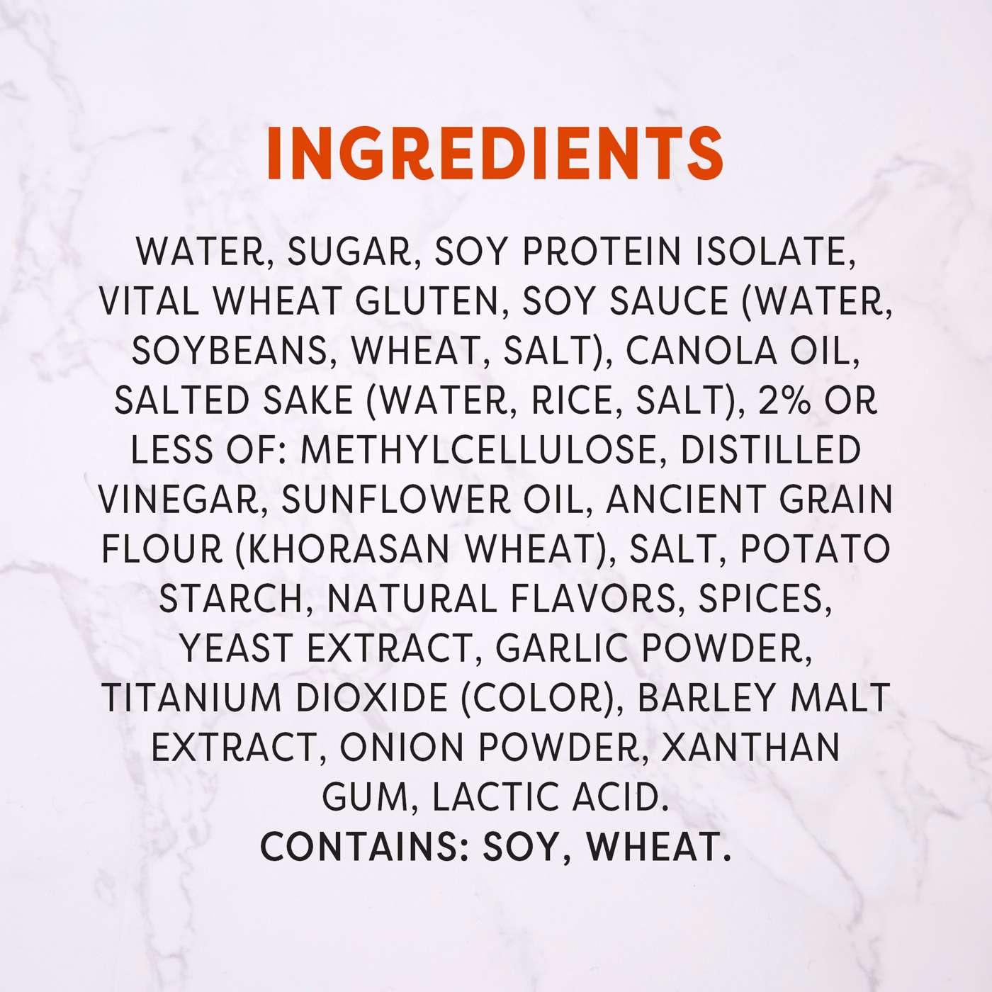 Water, Sugar, Soy Protein Isolate, Vital Wheat Gluten, Soy Sauce (Water, Soybeans, Wheat, Salt), Canola Oil, Salted Sake (Water, Rice, Salt), Less than 2% of: Methylcellulose, Distilled Vinegar, Calcium Carbonate, Salt, Potato Starch, Natural Flavors, Yeast Extract, Spices, Garlic Powder, Malt Extract (Malted Barley, Water), Onion Powder, Xanthan Gum, Lactic Acid.