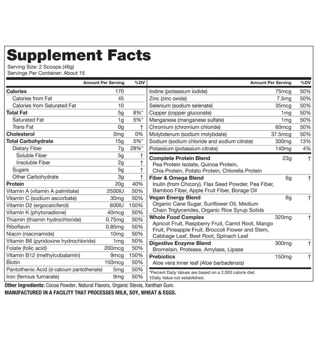 Complete Protein Blend: Pea Protein Isolate, Quinoa Protein, Chia Protein, Potato Protein, Chlorella Protein. Fiber & Omega Blend: Inulin (from Chicory), Flax Seed Powder, Pea Fiber, Bamboo Fiber, Apple Fruit Fiber, Borage Oil. Vegan Energy Blend: Organic Cane Sugar, Sunflower Oil, Medium Chain Triglycerides, Organic Rice Syrup Solids. Whole Food Complex: Apricot Fruit, Raspberry Fruit, Carrot Root, Mango Fruit, Pineapple Fruit, Broccoli Flower and Stem, Cabbage Leaf, Beet Root, Spinach Leaf. Digestive Enzyme Blend: Bromelain, Protease, Amylase, Lipase. Prebiotics: Aloe Vera Inner Leaf (Aloe Barbadensis). Other Ingredients: Natural Flavors, Cocoa (Processed with Alkali), Organic Stevia Leaf Extract, Xanthan Gum.Allergens and safety warnings