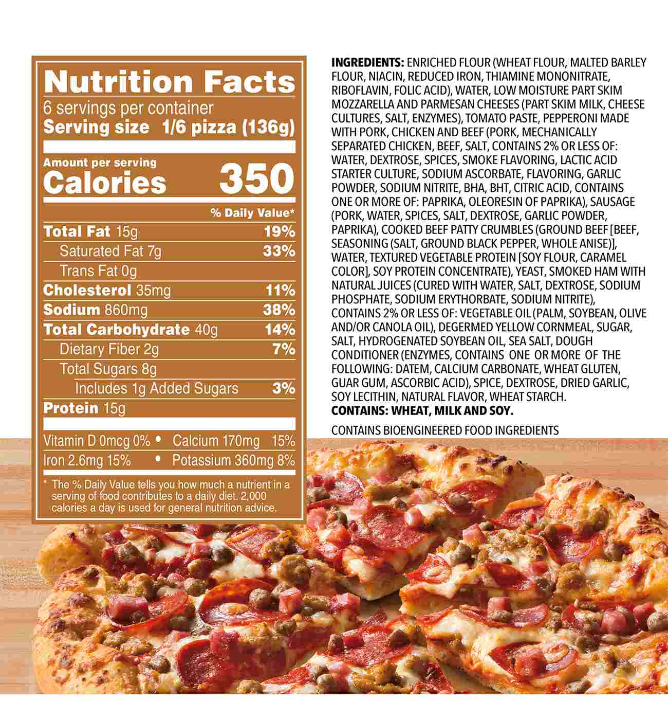 Enriched Flour (Wheat Flour, Malted Barley Flour, Niacin, Reduced Iron, Thiamine Mononitrate, Riboflavin, Folic Acid), Water, Low Moisture Part Skim Mozzarella And Parmesan Cheeses (Part Skim Milk, Cheese Cultures, Salt, Enzymes), Tomato Paste, Pepperoni Made With Pork, Chicken And Beef (Pork, Mechanically Separated Chicken, Beef, Salt, Contains 2% Or Less Of: Dextrose, Lactic Acid Starter Culture, Flavoring, Sodium Nitrite, Bha, Bht, Citric Acid. May Also Contain: Spices, Water, Paprika, Oleoresin Of Paprika, Spice Extractives, Smoke Flavoring, Sodium Ascorbate, Ascorbic Acid, Beef Stock), Sausage (Pork, Water, Spices, Salt, Dextrose, Garlic Powder, Paprika), Cooked Beef Patty Crumbles (Ground Beef [Beef, Seasoning (Salt, Ground Black Pepper, Whole Anise)], Water, Textured Vegetable Protein [Soy Flour, Caramel Color], Soy Protein Concentrate), Yeast, Smoked Ham With Natural Juices (Cured With Water, Salt, Dextrose, Sodium Phosphate, Sodium Erythorbate, Sodium Nitrite), Contains 2% Or Less Of: Vegetable Oil (Palm, Soybean, Olive And/Or Canola Oil), Degermed Yellow Cornmeal, Sugar, Salt, Hydrogenated Soybean Oil, Sea Salt, Dough Conditioner (Enzymes, Contains One Or More Of The Following: Datem, Calcium Carbonate, Wheat Gluten, Guar Gum, Ascorbic Acid), Spice, Dextrose, Dried Garlic, Soy Lecithin, Natural Flavor, Wheat Starch.Allergens and safety warnings