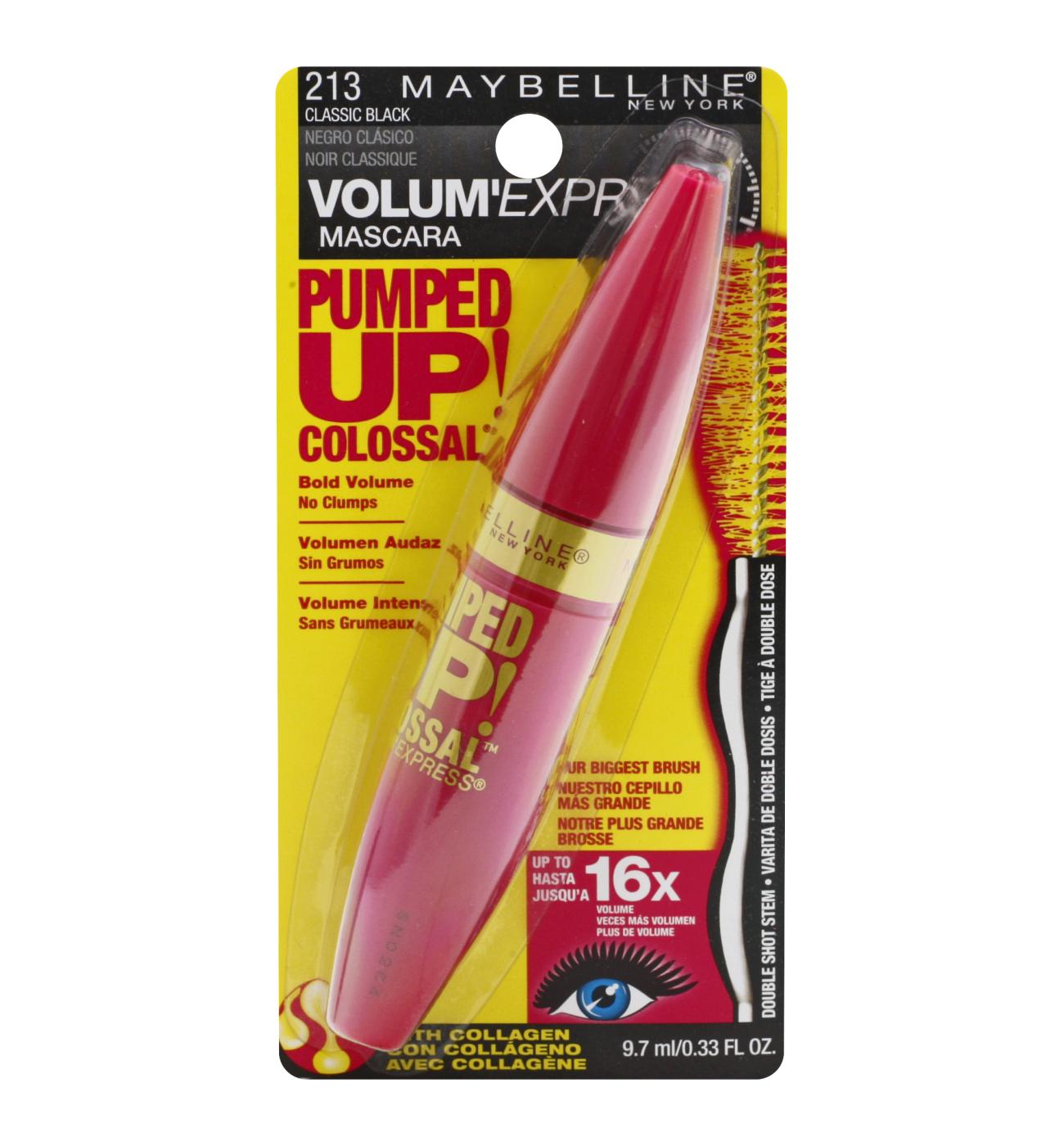 Lashes get amplified! The double collagen formula wraps each lash from root to tip for colossal impact, while Maybelline's biggest brush fills out lashes for a pumped up look. Ophthalmologist tested. Suitable for contact lens wearers.