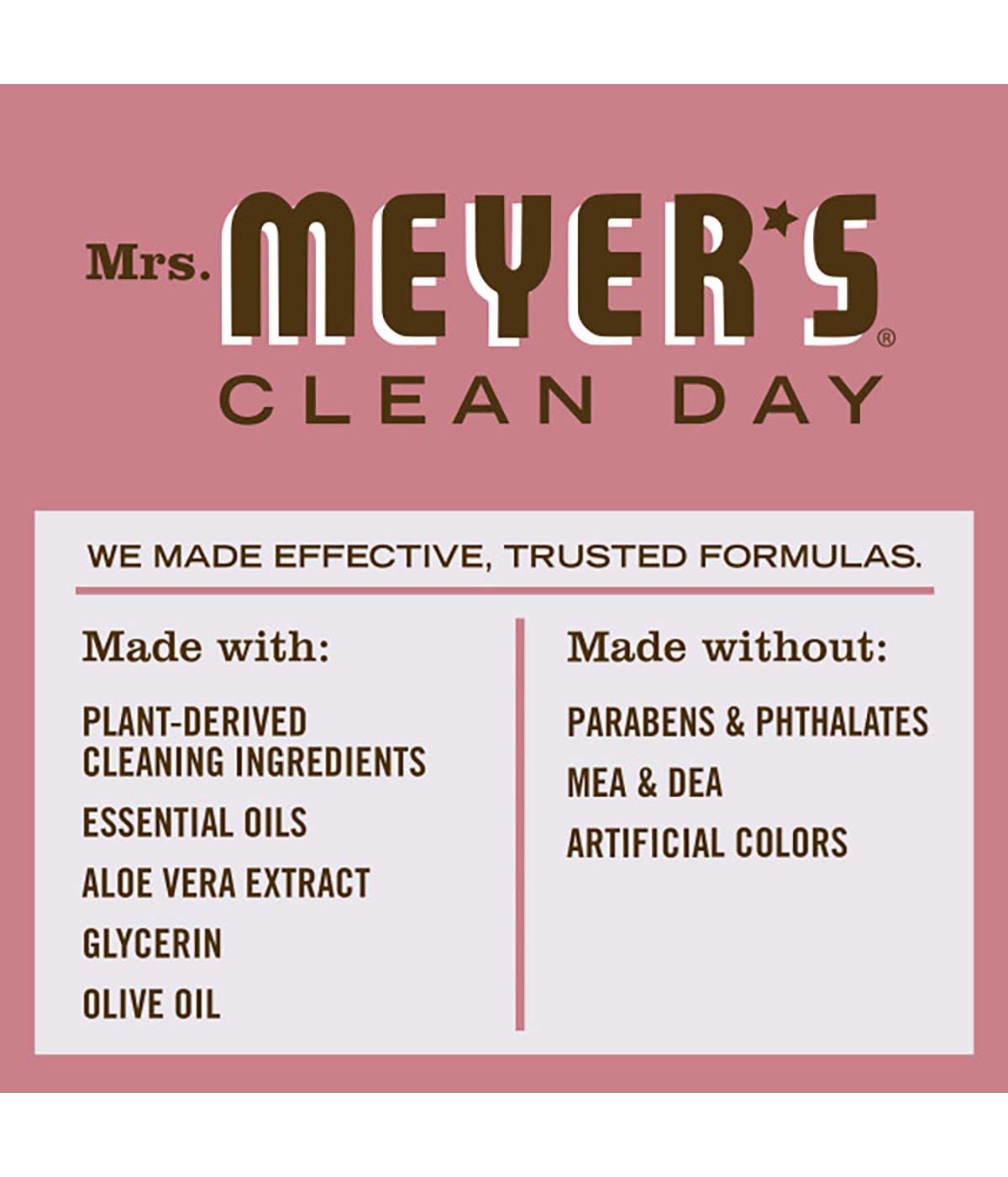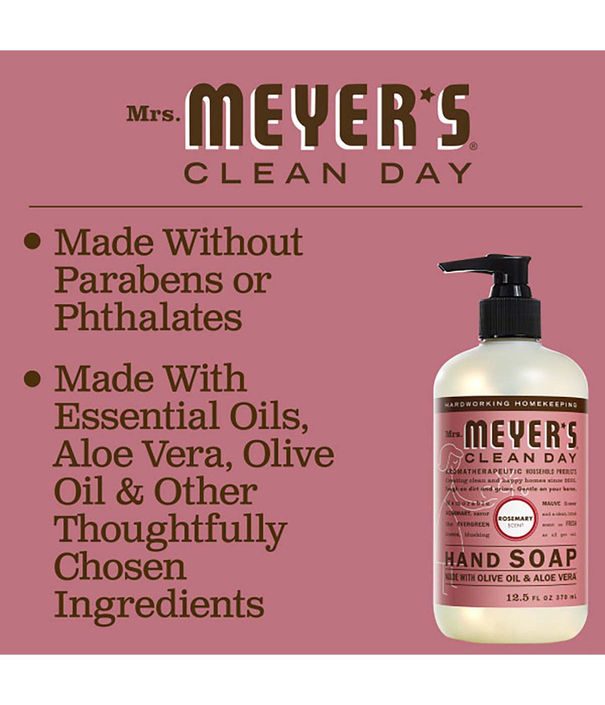 Made with olive oil & aloe vera. Hardworking homekeeping. Aromatherapeutic household products. Creating clean and happy homes since 2001. Tough on dirt and grime. Gentle on your home. Unforgettable rosemary, with evergreen needles and mauve blooms, has an inviting scent that is said to stimulate senses & improve memory. We make effective, trusted formulas. Made with: plant derived ingredients; natural essential oils; aloe vera extract; glycerin; olive oil. Made without: parabens & phthalates; Triclosan; MEA & DEA; formaldehyde; artificial colors. Bottles are made with at least 25% post-consumer plastic. Please recycle. Cruelty free. MrsMeyers.com. Contents are biodegradable. Product ingredients are at least 98% naturally derived. Learn about our ingredients at MrsMeyers.com/Ingredients-Glossary.