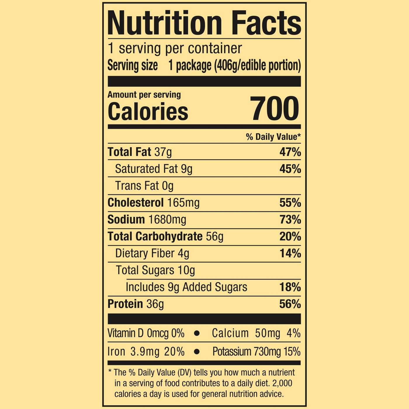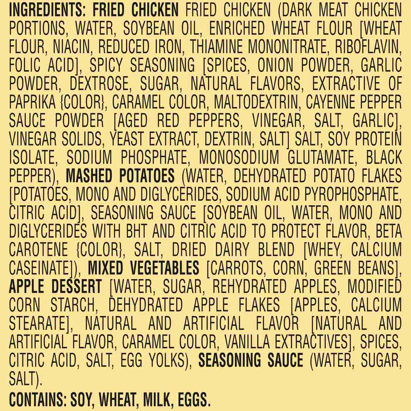 Fried Chicken: Dark Meat Chicken Portions, Water, Enriched Wheat Flour (Wheat Flour, Niacin, Reduced Iron, Thiamine Mononitrate, Riboflavin, Folic Acid), Less than 2% of: Salt, Spices, Potassium Phosphates, Monosodium Glutamate, Onion Powder, Garlic Powder, Dextrose, Sugar, Flavorings, Paprika Extract, Caramel Color, Cayenne Pepper Sauce Powder (Aged Red Peppers, Vinegar, Salt, Garlic), Vinegar Solids, Yeast Extract, Fried in Vegetable Oil, Mashed Potatoes: Rehydrated Potato Flakes and Granules (Water, Potatoes, Mono and Diglycerides, Disodium Dihydrogen Pyrophosphate, Sodium Bisulfite, Citric Acid, BHT), Soybean Oil, Water, Salt, Dried Dairy Blend (Whey, Calcium Caseinate), Mono- and Diglycerides, BHT and Citric Acid (to Protect Flavor), Beta Carotene (Color), Vegetable Blend: Carrots, Corn, Water, Green Beans, Sugar, Salt, Apple Dessert: Water, Sugar, Dried Apples, Modified Corn Starch, Dehydrated Apple Flakes, Natural and Artificial Flavor (Contains Vanilla Extractives and Caramel Color), Spices, Citric Acid, Salt, Dried Egg Yolks.Allergens and safety warnings