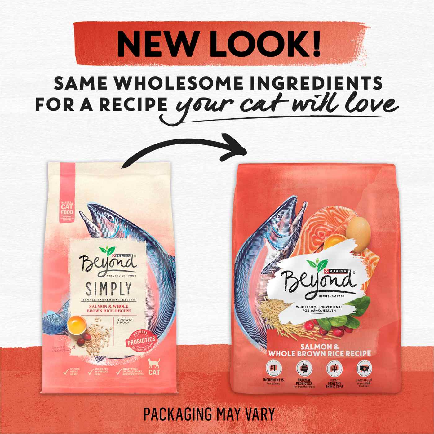 Feed your cat as nature intended with Purina Beyond Salmon and Whole Brown Rice Recipe adult dry cat food. Purina’s pet nutritionists select high-quality ingredients from their trusted sources for an adult cat food that helps support your cat’s healthy life with you. Real salmon with omegas is the number 1 ingredient in this high protein cat food with natural probiotics for cats to support her digestive health, while linoleic acid and vitamin E promote skin and coat health. This natural cat food with added vitamins, minerals and nutrients provides the 100 percent complete and balanced nutrition your adult cat needs to thrive. You know her best, so look to Beyond’s full line of recipes to make your cat’s meals your way. Serve her Purina Beyond cat food for the simple, wholesome nourishment she needs to live her best life with you. This cat food salmon recipe is crafted in U.S. facilities that use 80 percent electricity from renewable sources like wind, solar and hydro power.