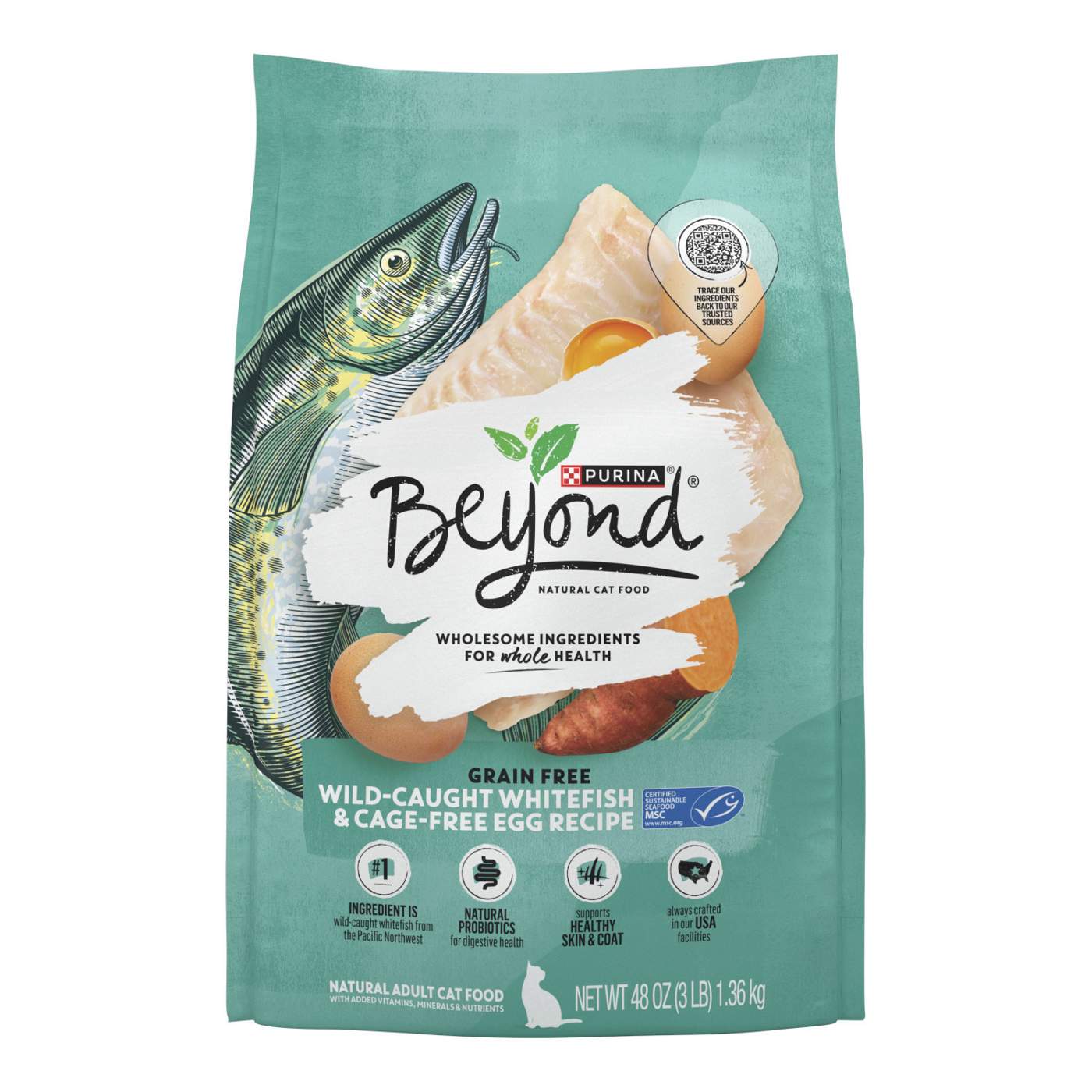 Nourish your cat the way nature intended with Purina Beyond Grain Free Wild-Caught Whitefish and Cage-Free Egg Recipe Natural dry adult cat food with added vitamins, minerals and nutrients. Purina’s pet nutritionist selects high-quality, recognizable ingredients from trusted sources for this simple ingredient cat kibble to help support your cat companion’s healthy life. This high protein cat food formula has real wild-caught whitefish as the number 1 ingredient, rounded out with purposeful ingredients, including cage-free egg and accents of sweet potato, to help your cat thrive. Plus, we include natural probiotics for cats to support her digestive health. This grain free cat food with added vitamins, minerals and nutrients gives your adult cat the 100 percent complete and balanced nutrition she needs to live her best life. No one knows your unique cat better than you, so look to the complete Beyond line to make her meals your way.