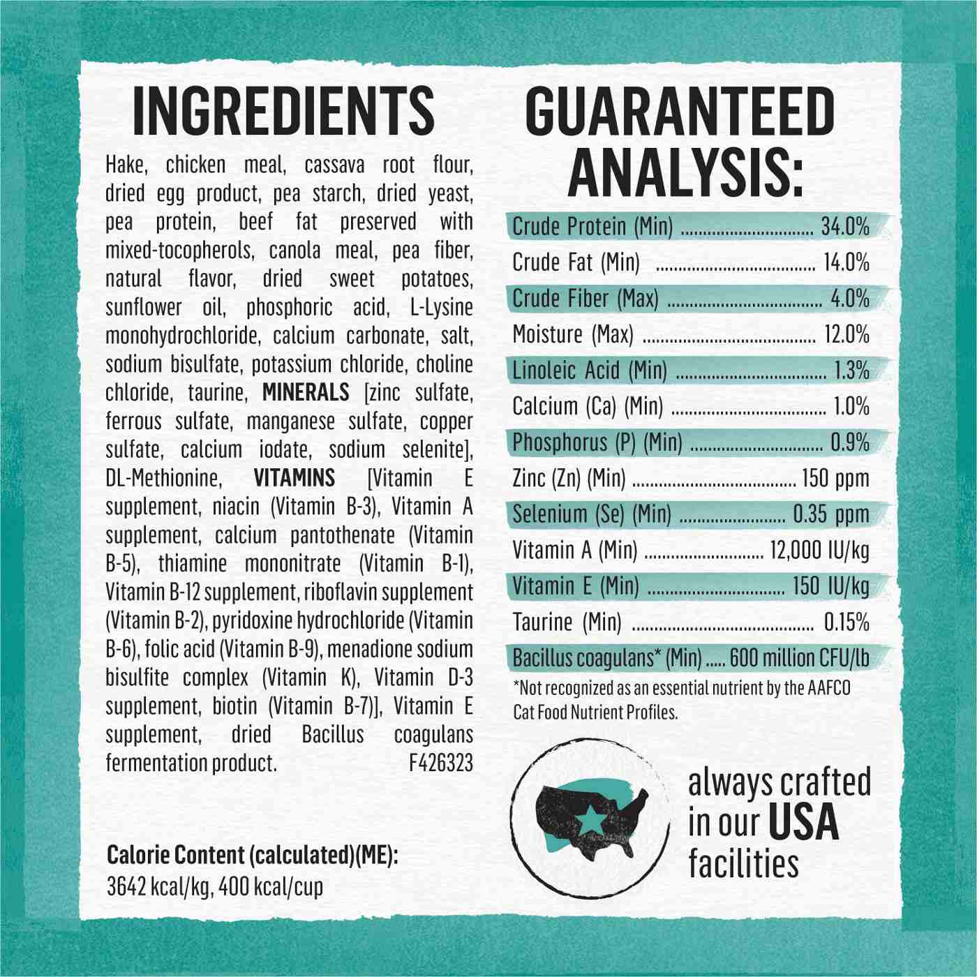 Hake, Chicken Meal, Cassava Root Flour, Dried Egg Product, Pea Starch, Dried Yeast, Pea Protein, Beef Fat Preserved With Mixed-Tocopherols, Canola Meal, Pea Fiber, Natural Flavor, Dried Sweet Potatoes, Sunflower Oil, Phosphoric Acid, L-Lysine Monohydrochloride, Calcium Carbonate, Salt, Sodium Bisulfate, Potassium Chloride, Choline Chloride, Taurine, MINERALS [zinc sulfate, ferrous Sulfate, Manganese Sulfate, Copper Sulfate, Calcium Iodate, Sodium Selenite], Dl-Methionine, VITAMINS [Vitamin E Supplement, Niacin (Vitamin B-3), Vitamin A Supplement, Calcium Pantothenate (Vitamin B-5), Thiamine Mononitrate (Vitamin B-1), Vitamin B-12 Supplement, Riboflavin Supplement (Vitamin B-2), Pyridoxine Hydrochloride (Vitamin B-6), Folic Acid (Vitamin B-9), Menadione Sodium Bisulfite Complex (vitamin k), Vitamin D-3 Supplement, Biotin (Vitamin B-7)], Vitamin E Supplement, Dried Bacillus Coagulans Fermentation Product. F426323