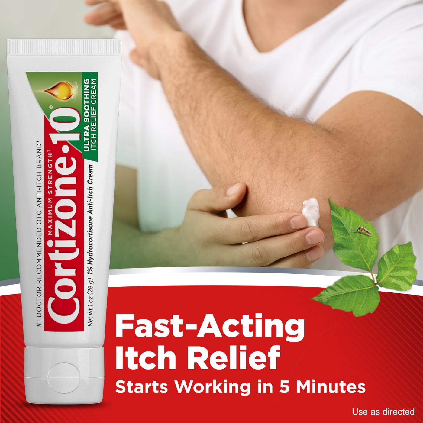 Stop the itchsanity with Cortizone-10 Maximum Strength* Ultra Soothing Itch Relief Cream. Formulated with 1% hydrocortisone, this anti-itch cream starts working fast to relieve itch associated with minor skin irritations, inflammation, and rashes due to eczema, psoriasis, insect bites, seborrheic dermatitis, poison ivy, oak, sumac, detergents, jewelry, cosmetics and soap. Cortizone-10 Ultra Soothing Itch Relief Cream uses 10 moisturizers to nourish, hydrate, and restore skin's moisture barrier in a fragrance-free and dye-free formula. It's the perfect addition to first aid kits, camping gear and travel essentials, so itching from pesky mosquito bites doesn't ruin your time outdoors. No wonder it's the No. 1 doctor-recommended OTC anti-itch brand**. *Among Topical Anti-Itch OTCs **2024 IQVIA Study
