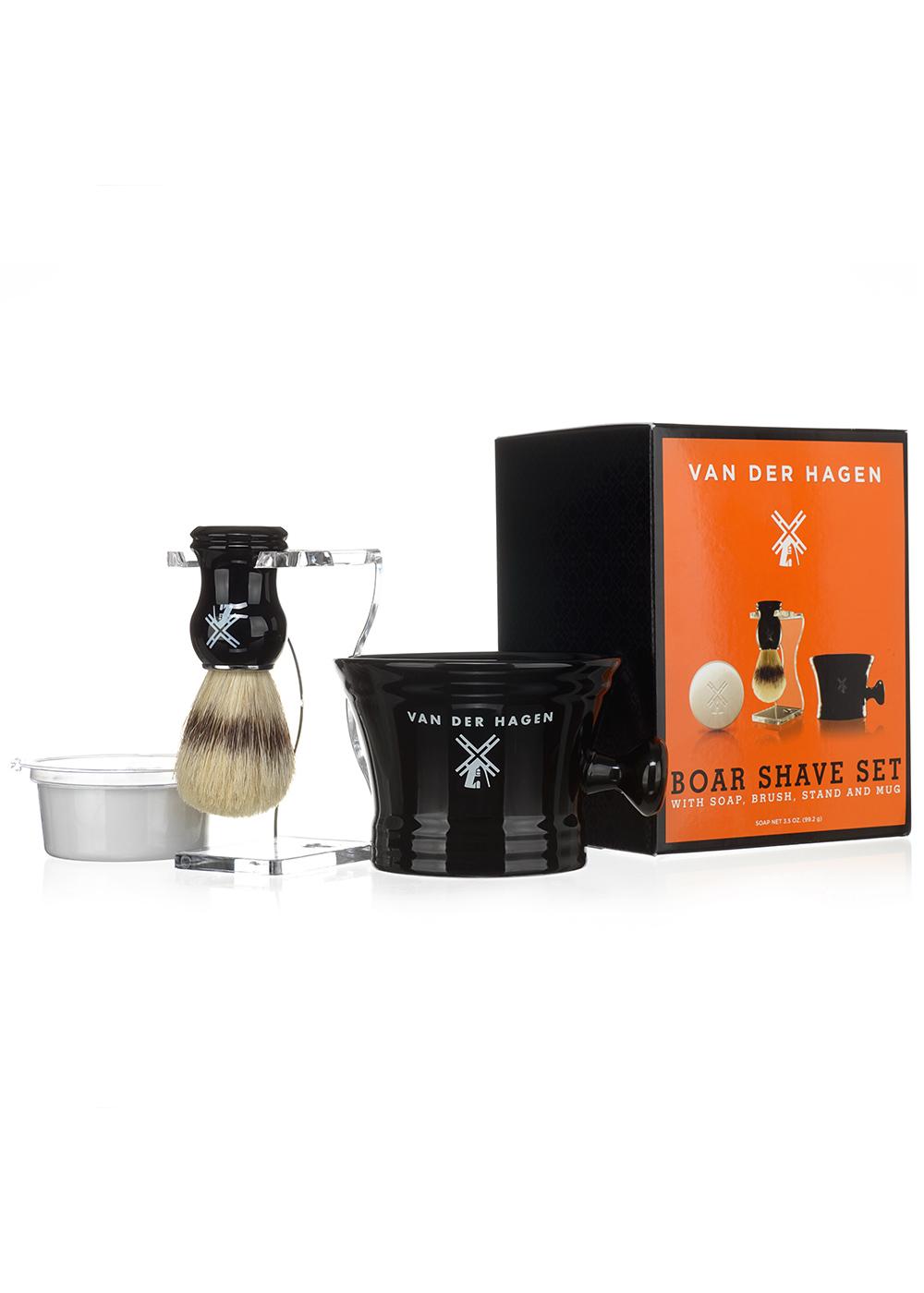 Van der Hagen shave set includes a hypo-allergenic shave soap with over 10% Glycerin & emollient Shea, Mango & Cocoa Butters; a handsome monogrammed natural boar shave brush; a specially designed classic monogrammed apothecary mug and a sturdy acrylic combination razor and brush stand made exclusively to fit our brush.