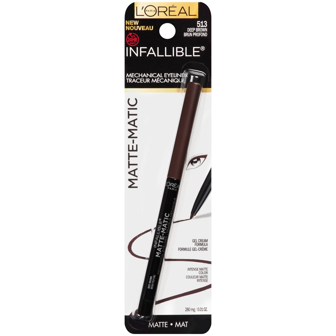 Achieve precise definition with the L'Oréal Paris Infallible Matte-Matic Mechanical Eyeliner. This liner delivers intense, long-lasting matte color in the versatile 'Deep Brown' shade. The unique gel-cream formula glides on smoothly for easy application, setting to a smudge-resistant finish.• Mechanical pencil design never needs sharpening• Gel-pencil formula glides on without tugging• Sets to a long-wearing, smudge-resistant matte finish
