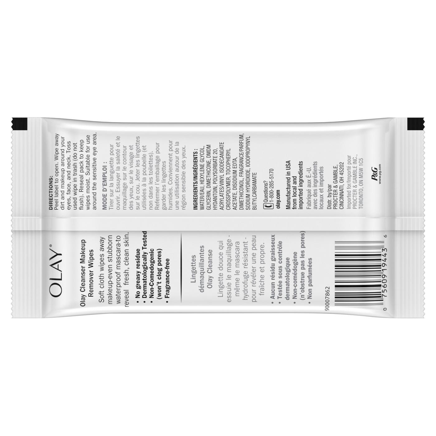 Wipe your skin clean with the power of Olay Cleanse Makeup Remover Wipes. Ideal for everyday use, these soft cloths clear your face of makeup, dirt and oil-even waterproof mascara. Use these wipes around your eyes, face and neck. These fragrance-free wipes won't clog pores or leave any greasy residue, leaving skin clean and feeling fresh. For daily use, on-the-go and travel, feel flawless and confident every day with Olay Cleanse Makeup Remover Wipes. We guarantee you'll love your OLAY product! If you are not satisfied, we'll give you your money back via a prepaid card. Must submit within 60 days of purchase. Call toll-free 1-855-845-9797 or visit olay.com/guarantee.