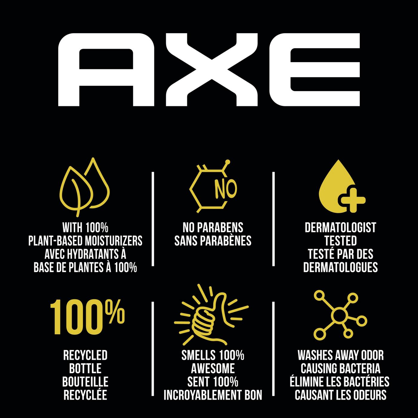 AXE Black Body Wash features a subtle and refined scent of crisp frozen pear and warm cedarwood. The formula contains 100% plant-based moisturizers to help leave skin feeling soft and hydrated. Its lasting fragrance provides a refreshed feeling for up to 12 hours.• Subtle scent of frozen pear and cedarwood• Provides a refreshing scent for up to 12 hours• Formulated with 100% plant-based moisturizers• Leaves skin feeling clean, soft, and hydrated