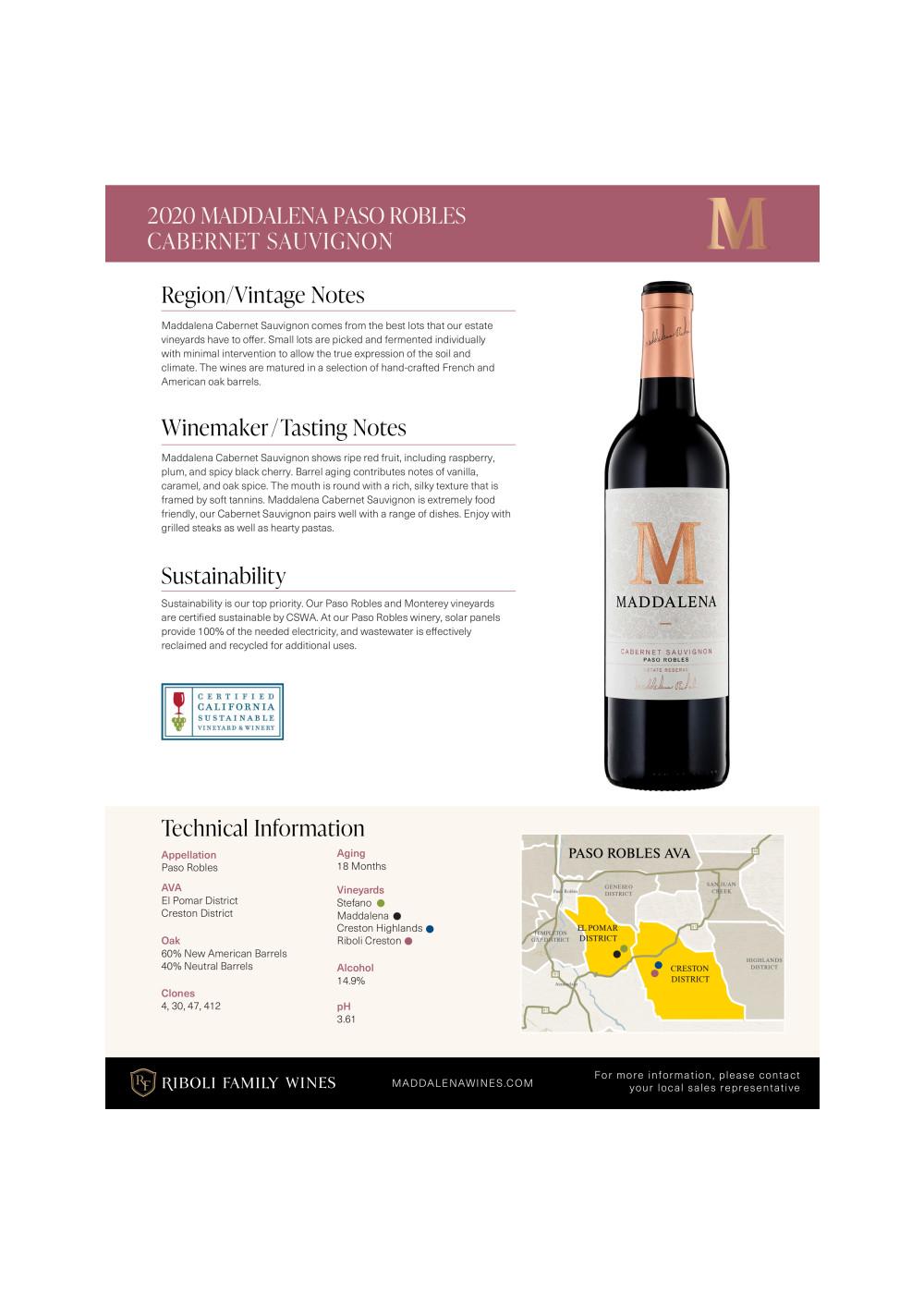 Maddalena Cabernet Sauvignon Red Wine comes from the best lots that our estate vineyards have to offer. Small lots are picked and fermented individually with minimal intervention to allow the true expression of the soil and climate. The wines are matured in a selection of hand-crafted French and American oak barrels. Maddalena Cabernet Sauvignon shows ripe red fruit, including raspberry, plum, and spicy black cherry. Barrel aging contributes notes of vanilla, caramel, and oak spice. The mouth is round with a rich, silky texture that is framed by soft tannins. Maddalena Cabernet Sauvignon is extremely food friendly, our Cabernet Sauvignon pairs well with a range of dishes. Enjoy with grilled steaks as well as hearty pastas. Sustainability is our top priority. Our Paso Robles and Monterey vineyards are certified sustainable by CSWA.