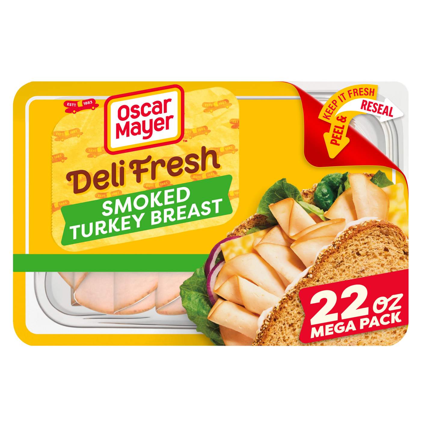 Make a delicious deli sandwich at home with Oscar Mayer Deli Fresh Smoked Turkey Breast Sliced Lunch Meat Mega Pack. Our quality turkey deli meat is made with no artificial preservatives*, no added hormones**, and no added nitrates or nitrites. Fully cooked and ready to eat, our turkey slices have a mouthwatering smoky flavor that's perfect for a classic turkey sandwich, salad, or cheese and crackers. Keep our mega pack 22-ounce package of deli turkey refrigerated to maintain freshness. If you enjoy our smoked deli turkey, be sure to try the other varieties of Oscar Mayer turkey lunch meat. *See back panel for ingredients to support quality. **Federal regulations prohibit the use of hormones in poultry. .• One 22 oz mega pack tray of Oscar Mayer Deli Fresh Smoked Turkey Breast Sliced Lunch Meat Mega Pack• Oscar Mayer Deli Fresh Smoked Turkey Breast Sliced Lunch Meat is made from turkey raised with no added hormones *Federal regulations prohibit the use of hormones in poultry• Smoked turkey breast lunch meat has no artificial preservatives* and no added nitrates or nitrites. *See back panel for ingredients to support quality• Our sliced turkey breast has a mouthwatering rich and smoky flavor• Smoked turkey breast slices are fully cooked and ready to eat• Add a few slices of smoked turkey breast lunch meat to sandwiches, wraps, deli platters, salads, or cheese and crackers• So many ways to keep it Oscar with our wide range of cold cuts, bacons, hot dogs and meat snack plates
